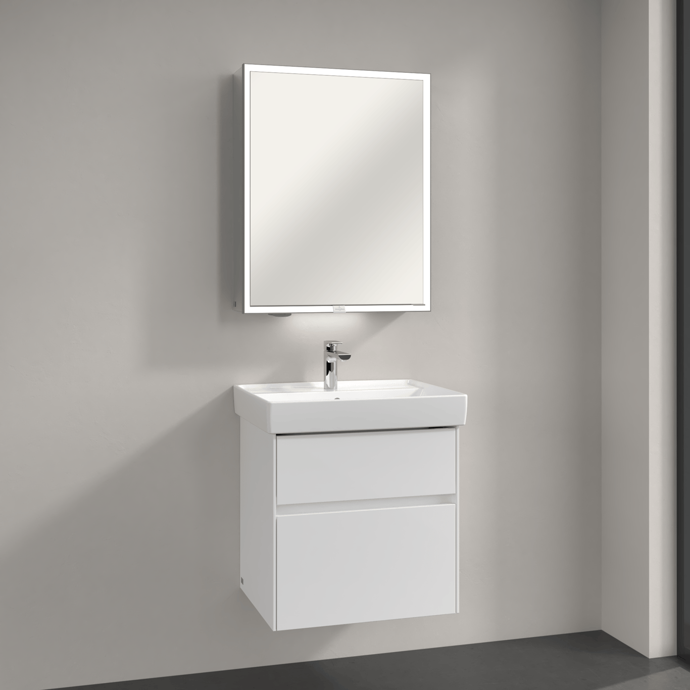 Dette speilskapet fra Villeroy & Boch har integrert LED-lys, og et smart system for oppbevaring av baderomsartikler.