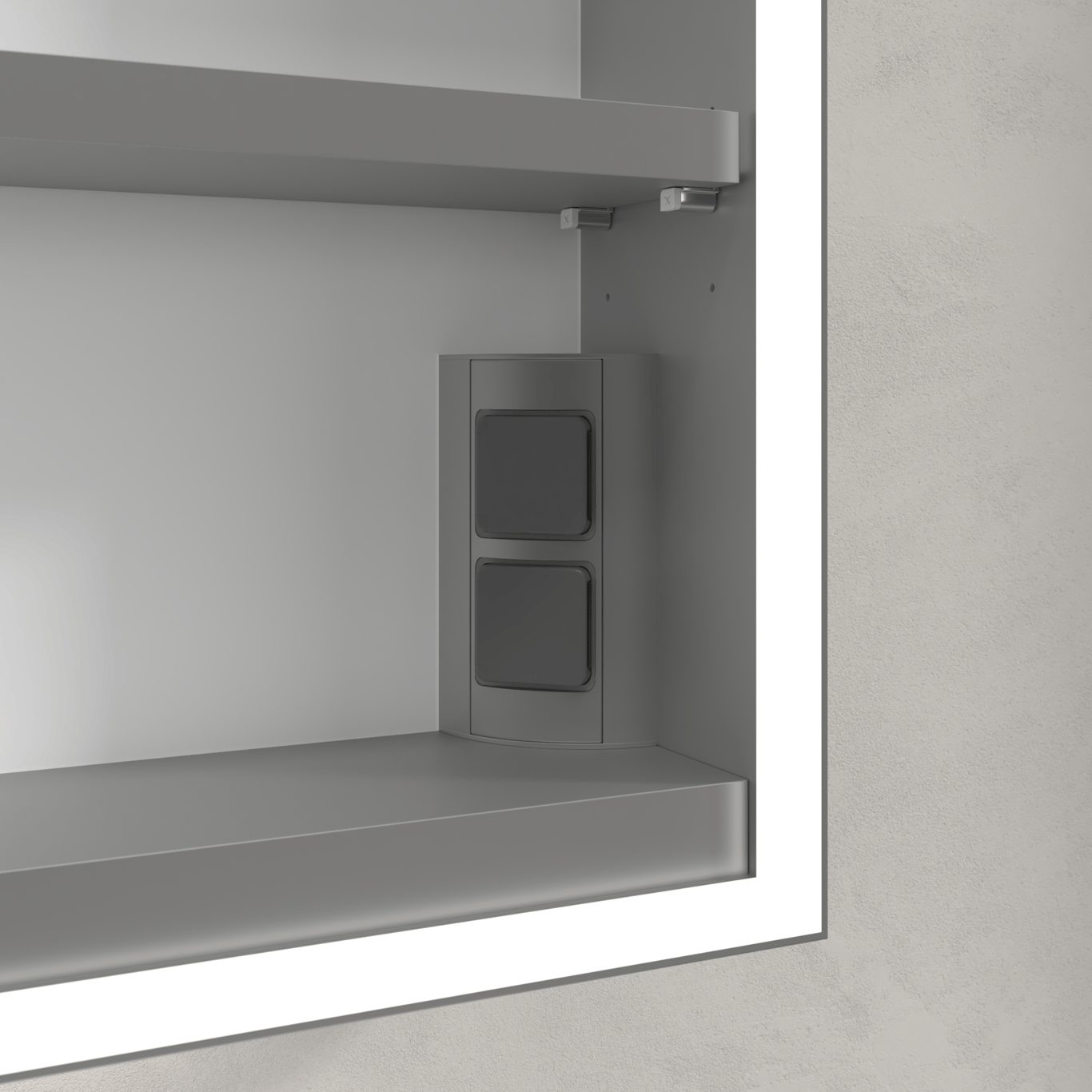- Følger med: 1 x dør 1 x På/Av-bryter på utsiden 2 x stikkontakt på innsiden (høyre) 1 x stikkontakt på utsiden (venstre) 2 x aluminiumshyller 1 x oppbevaringsskål 1 x forstørrelsesspeil 1 x magnetlist