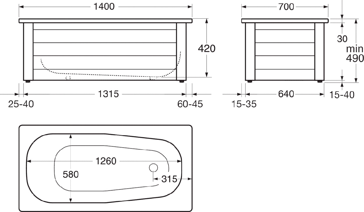 Frontstativ til Gustavsberg badekar. Badekarfronten leveres med én gavl og én front. Føttene kan justeres 25mm.