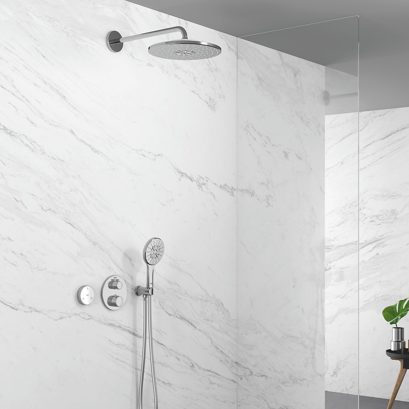 tilhørende innvendig del:GROHE Rapido SmartBox 35 600/35 604GROHE TurboStat kompakt patronmed voks termoelementGROHE StarLight krom overflatedekkskive med GROHE FastFixation(dekket rosett- og akseltetning, skjult feste)metall rosett, med tilbakevirkende kraft 6° justerbarprintet hode- og hånddusj symbolerGROHE SafeStop ved 38°CGROHE SafeStop Plus valgfri temperaturbegrensning på 43°C / 46°C inkludertGROHE AquaDimmer, integrert omskifter/avstegningsventilflyt ytelse: utløp B = 27 l/min, utløp C = 30 l/minuten rørsettVann- og avløpsinstallasjoner må installeres av rørlegger.