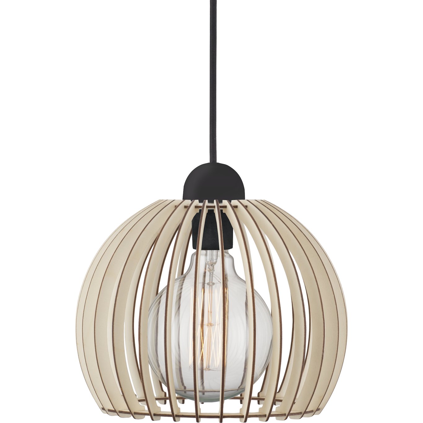 Pendellampe i et grafisk design med en skjerm av trelameller som gir en behagelig lysspredning. Fordi lyskilden er synlig mellom lamellene, anbefales det å supplere lampen med en dekorativ pære. Lampen er blant annet ideell over kjøkken- eller spisebord, og leveres uten lyskilde.