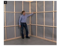 7. Montering av første panel: Begynn å installere til høyre for en innerhjørne-profil. Det første panelet skal alltid kappes på venstre side for å sikre riktig tykkelse i innerhjørne-profilen. Mål bredden fra pinnen på innerhjørne-profilen til midten av den første vertikale stender i stenderverket. Skjær panelet i riktig bredde. Plasser panelet på tappen av bunnprofilen inntil pinnen på innerhjørne-profilen. Pass på at panelet er i vater.