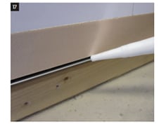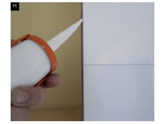 17. Etterfuging mellom paneler og bunnprofil: Bruk maskeringstape nederst langs alle panelene. Legg fugemasse i åpningen mellom bunnprofil og paneler slik at den er godt synlig. Bruk en fordeler i hard gummi eller myk plast for å lage en rett og fin kant mellom bunnprofil og paneler. Riv av maskeringstapen. Legg fugemasse på fingeren og trykk fugemasse inn under overgangen mellom innerhjørne-profilene og bunnprofilene.