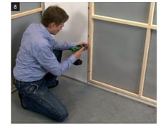 8. Skru panelet til stenderverket. Bruk skruer hver 20 cm i høyden på panelet (første skrue nedenfra skal også gå gjennom ryggen av bunnprofilen).