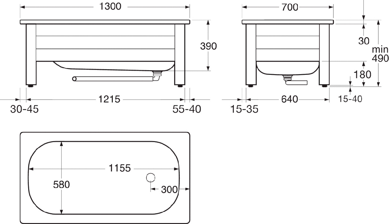Frontstativ til Gustavsberg sittekar. Badekarfronten leveres med én gavl og én front. Føttene kan justeres 25mm.