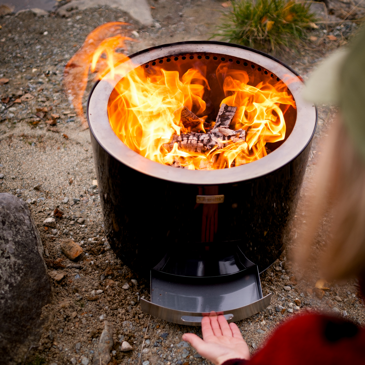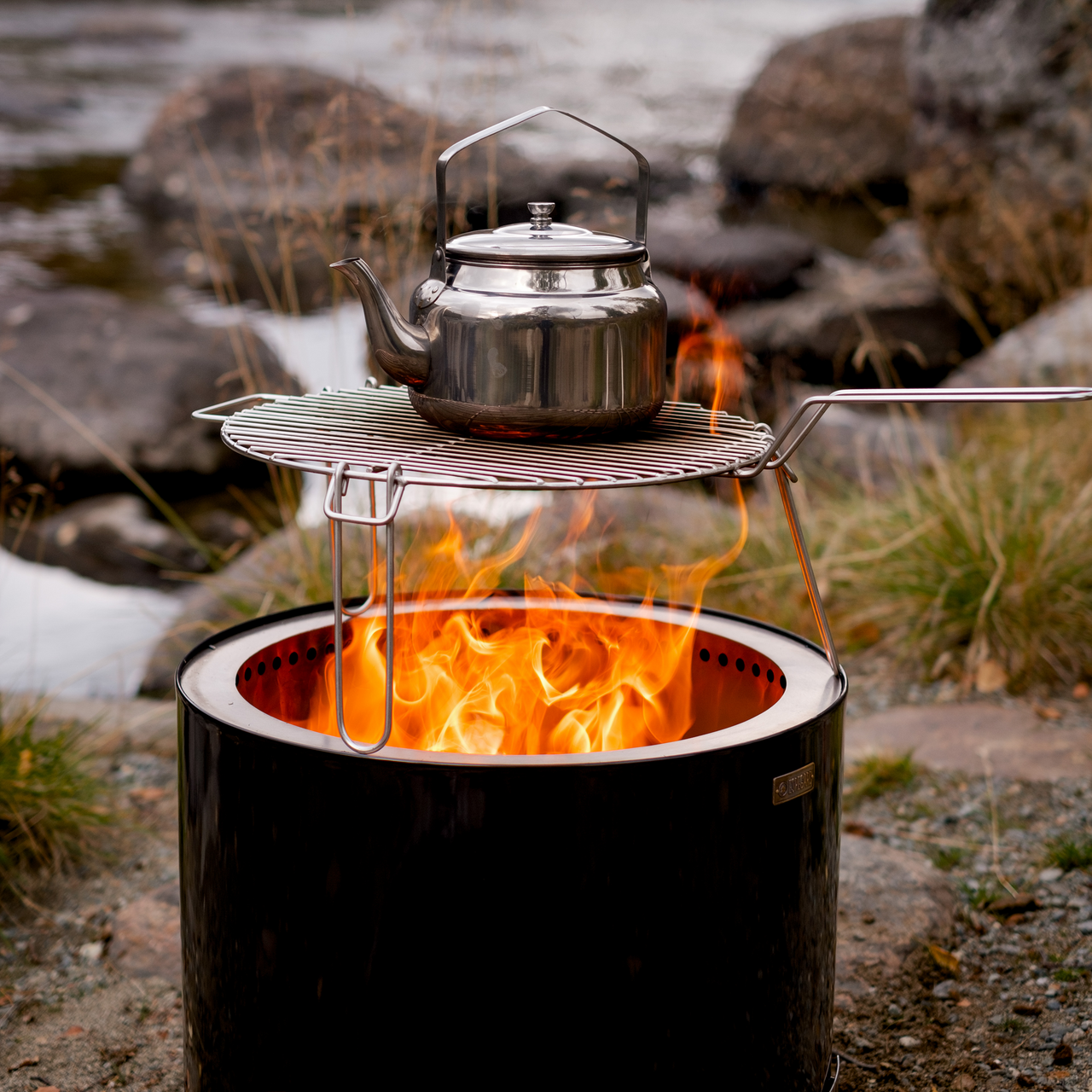Den står stødig på tre korte bein som er enkle å montere, og har en integrert toppring for ekstra sikkerhet. Det følger med en praktisk askeskuff som gjør det lett å tømme asken.