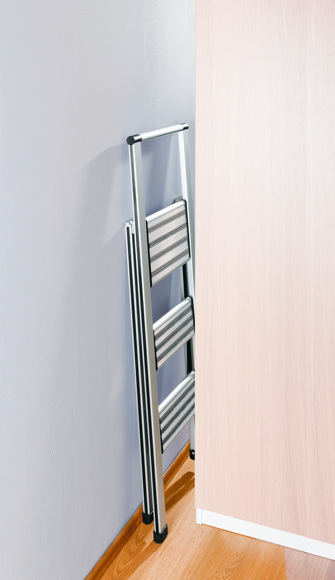 Denne stigen fra Wenko er laget i aluminum og har sklisikre trinn med gummiert overflate. Stigen kan legges sammen for enkel oppbevaring.