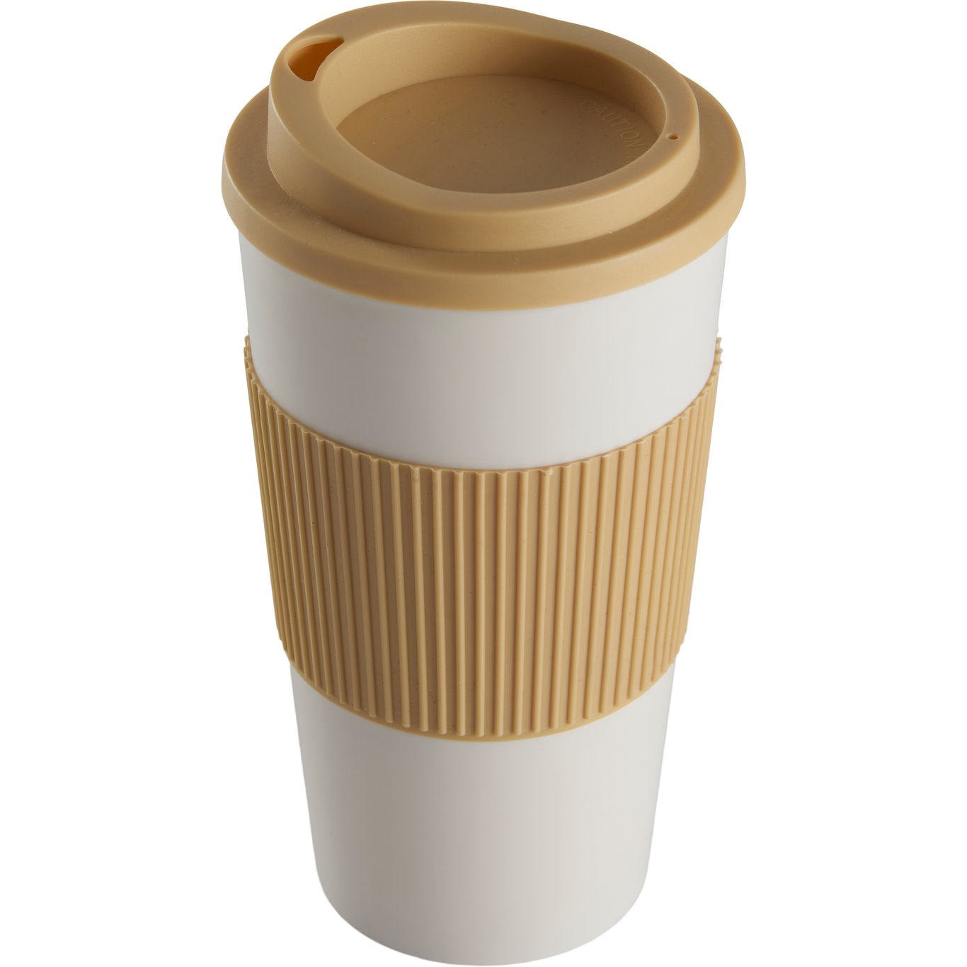 Dette termokruset fra Day gjør det enkelt å ta med seg drikke på farten. Den har dobbelvegg i plast, og bånd rundt.