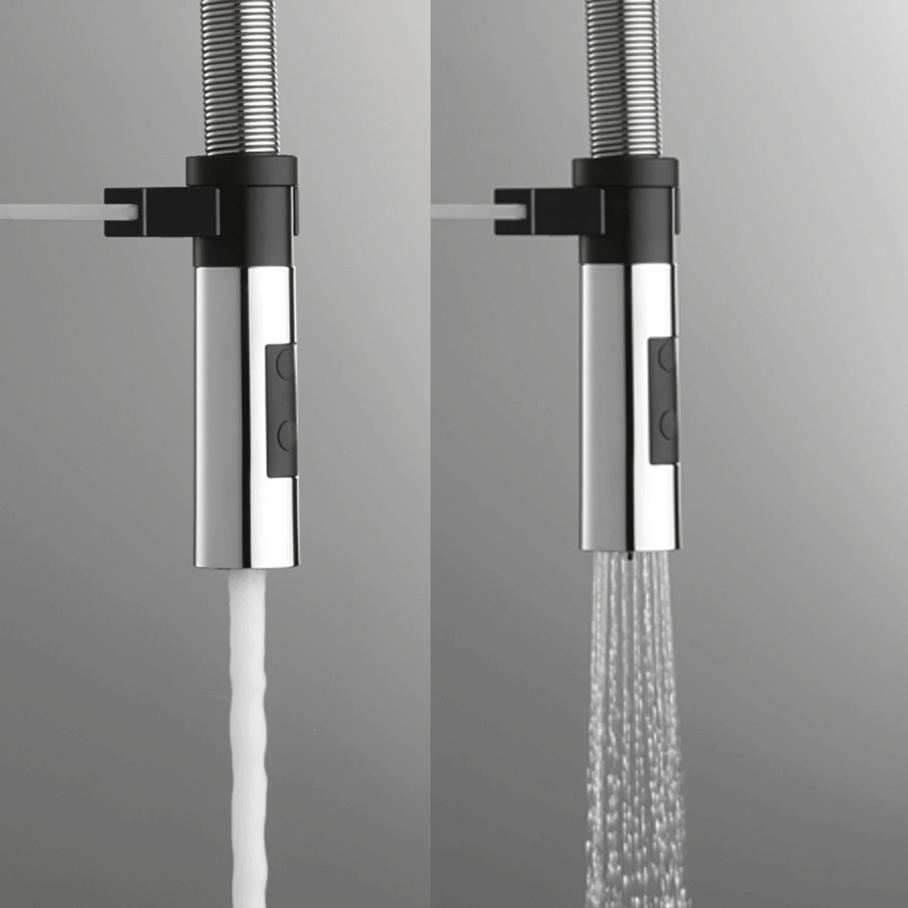 Hånddusjen kan enkelt kobles ut av holderen, noe som gjør rengjøring av kjøkkenredskaper enklere. Den har vannbesparende perlator, som gir en vannstråle blandet med luft, som gjør at strålen føles sterkere. Dette gjør at du derfor kan bruke lavere vanntrykk og redusere vannforbruket.
