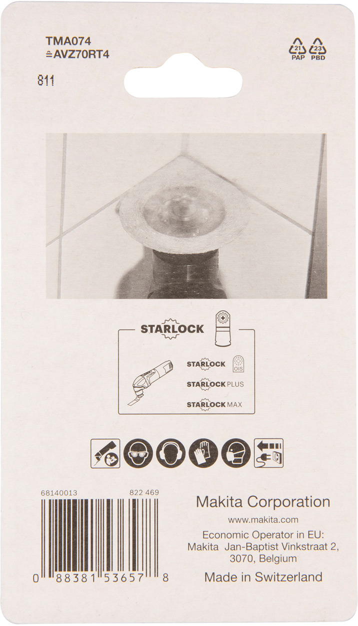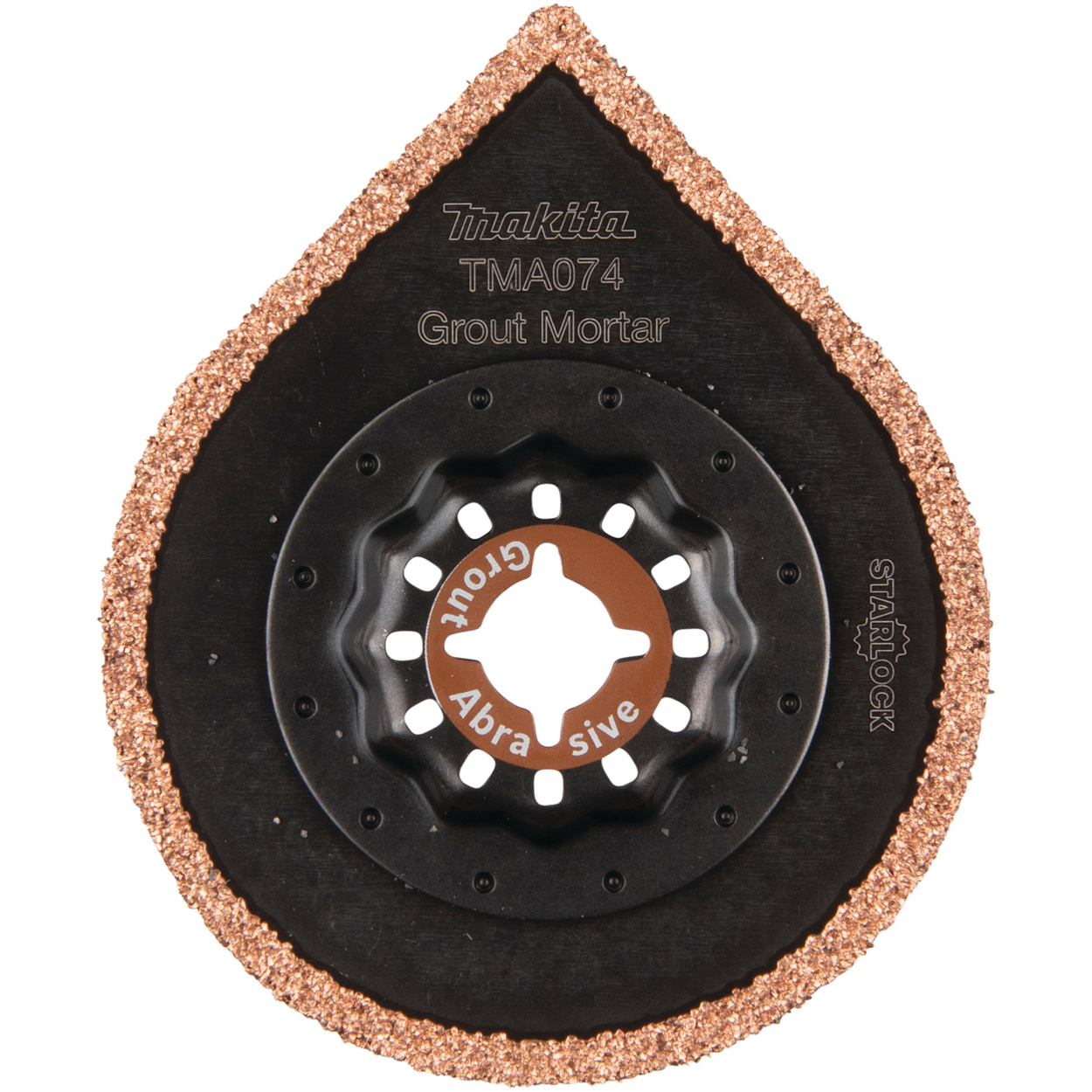 Starlock multi mørtelfjerner med wolframkarbid korning K40. Bruk den avrundede kanten til å fjerne flisefuger i hjørner, bruk den spisse tuppen til å skjære bort fuger mellom flisene, og bruk flaten til å pusse bort mørtelrester på flater.