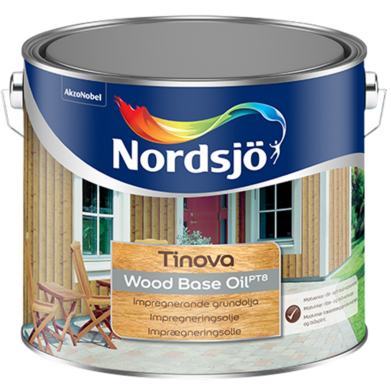 Nordsjö Tinova Wood Base Oil PT8 er en ikkefilmdannende impregneringsolje, som trenger inn i treverket og forhindrer fuktopptak og reduserer risikoen for sprekker.