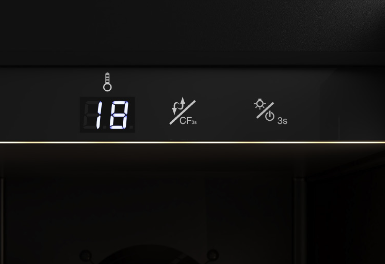 Tidløst, stillegående vinskap med elektronisk betjeningspanel og innebygde LED-lys på topp og sider. Skapet inneholder 5 hyller, hvor hyllene er produsert av FSC godkjent treverk fra bøkefamilien.