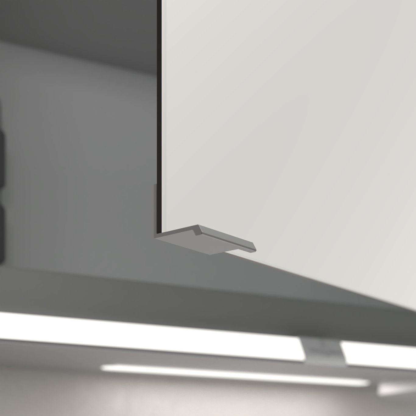 Skapet har et smart system for oppbevaring som består av hyller, en magnetstripe for enkel oppheng av for eksempel pinsett og neglesaks, og stikkontakter, og et mindre forstørrelsesspeil.