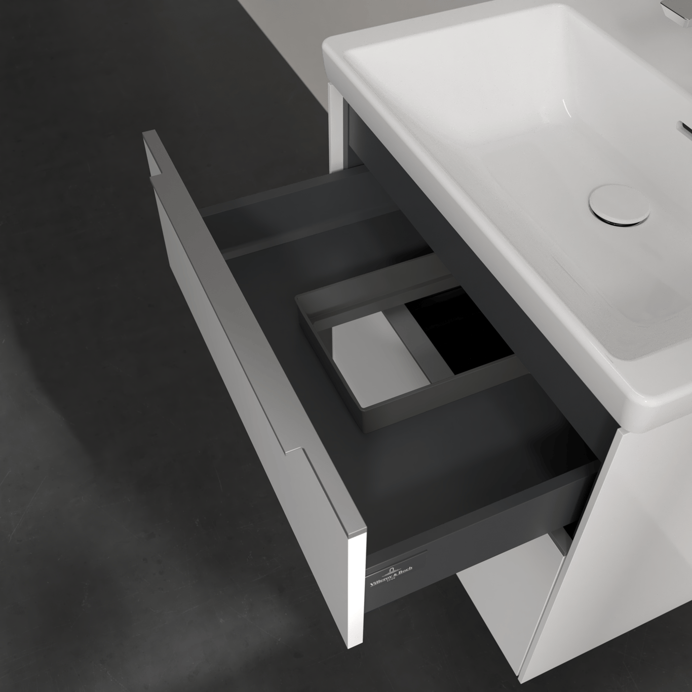 Servantskapet har skuffer med god oppbevaringsplass, og en soft close- og self close-funksjon som sørger for myk lukking, selv når skuffene blir smelt igjen.