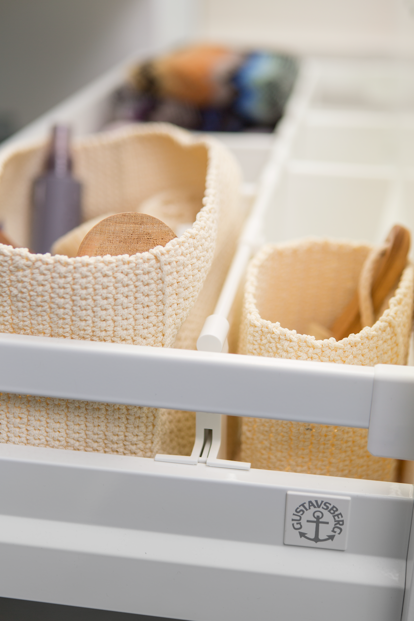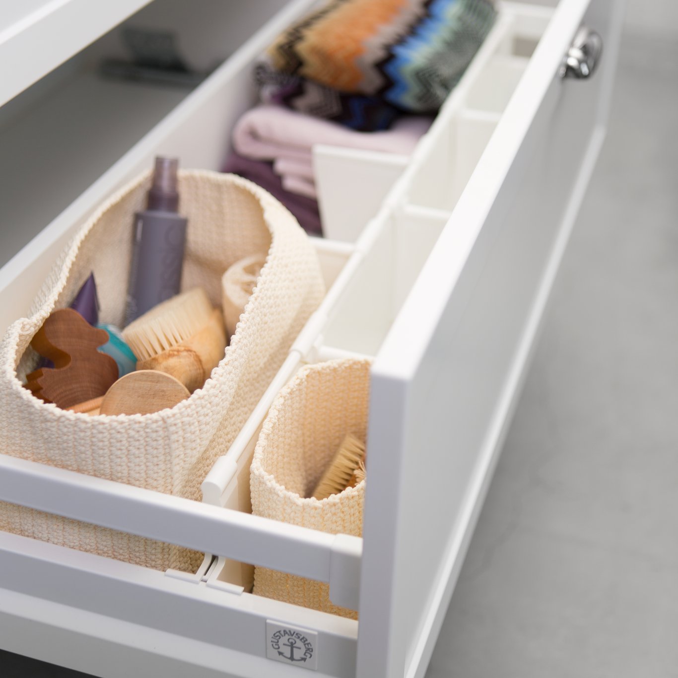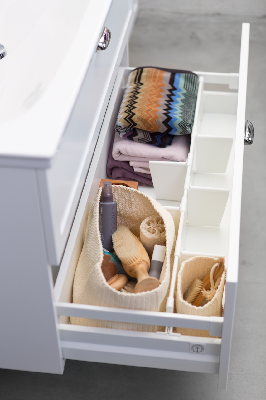 Praktisk justerbar skuffeinnsats skreddersydd til Gustavsberg Artic møbler. Passer til nedre skuff i Artic baderomsmøbel med 60 og 120 cm bredde.