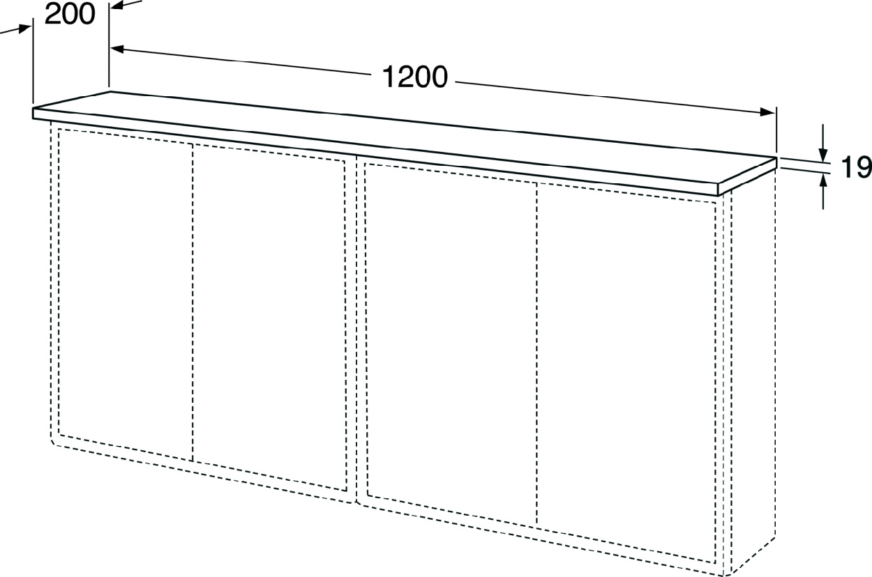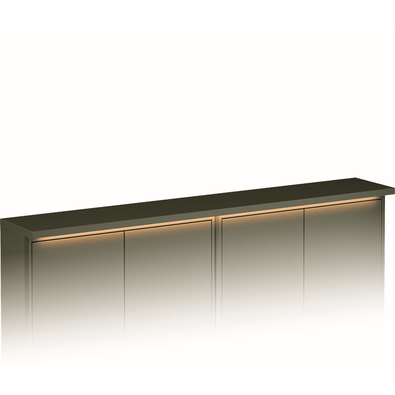 Denne topplaten er perfekt å montere på toppen av to grønne veggskap fra Gustavsberg. Møbelet har integrert belysning som lyser opp inni skapet når skapdørene er åpne, og som gir en dekorativ belysning av skapdørene når de er lukket.