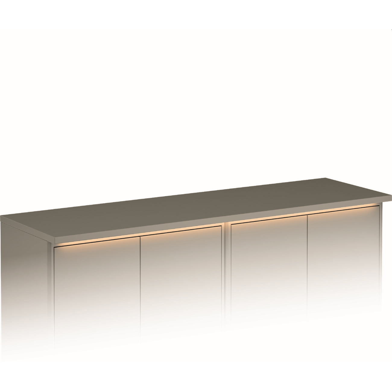 Denne topplaten er perfekt å montere på toppen av to grå veggskap fra Gustavsberg. Møbelet får integrert belysning som lyser opp inni skapet når skapdørene er åpne, og som gir en dekorativ belysning av skapdørene når de er lukket.