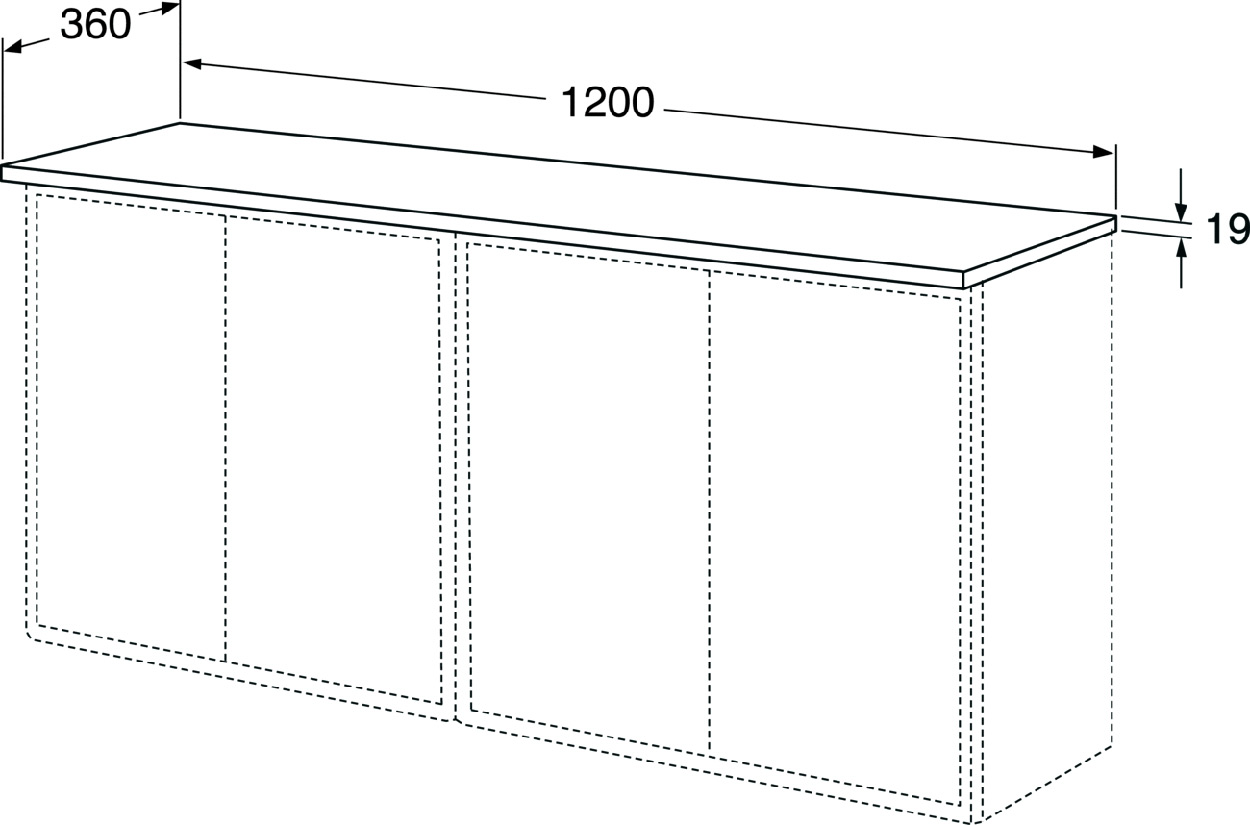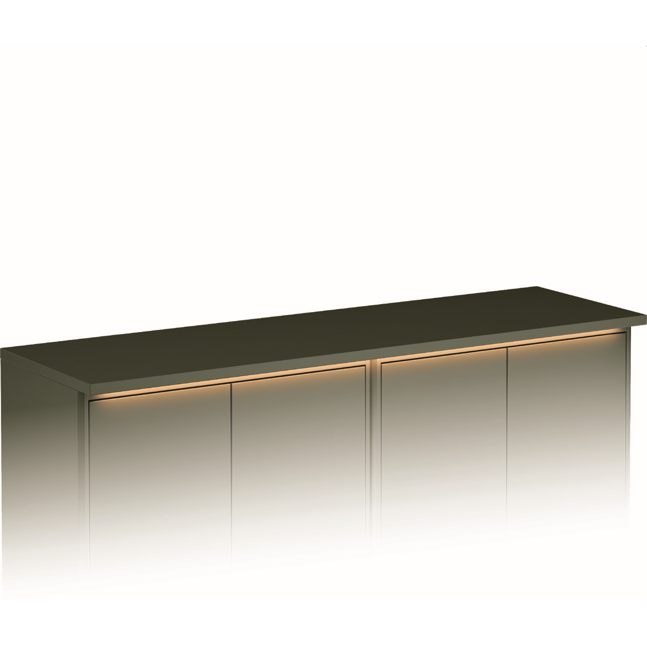 Denne topplaten er perfekt å montere på toppen av to grønne veggskap fra Gustavsberg. Møbelet har integrert belysning som lyser opp inni skapet når skapdørene er åpne, og som gir en dekorativ belysning av skapdørene når de er lukket.