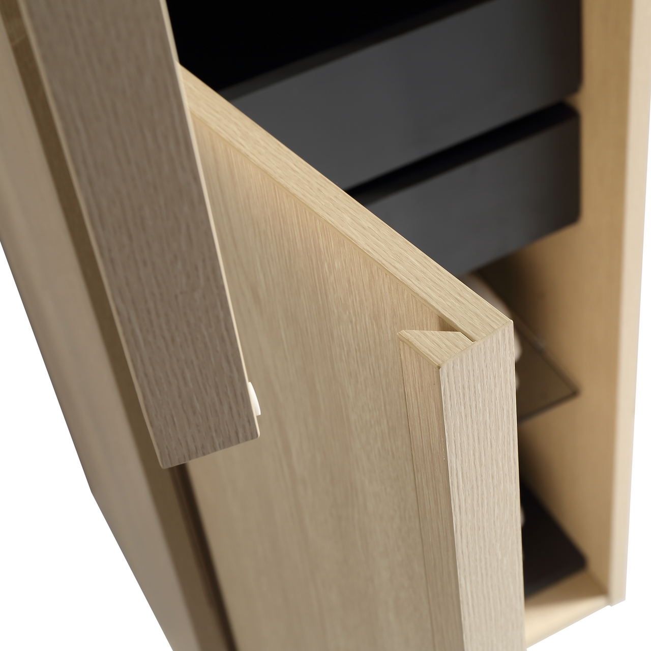 Høyskapet kommer ferdig montert, og har tre glasshyller, samt to innvendige skuffer for praktisk oppbevaring. Dørene har en soft close-funksjon som sørger for myk lukking og forlenger levetiden.