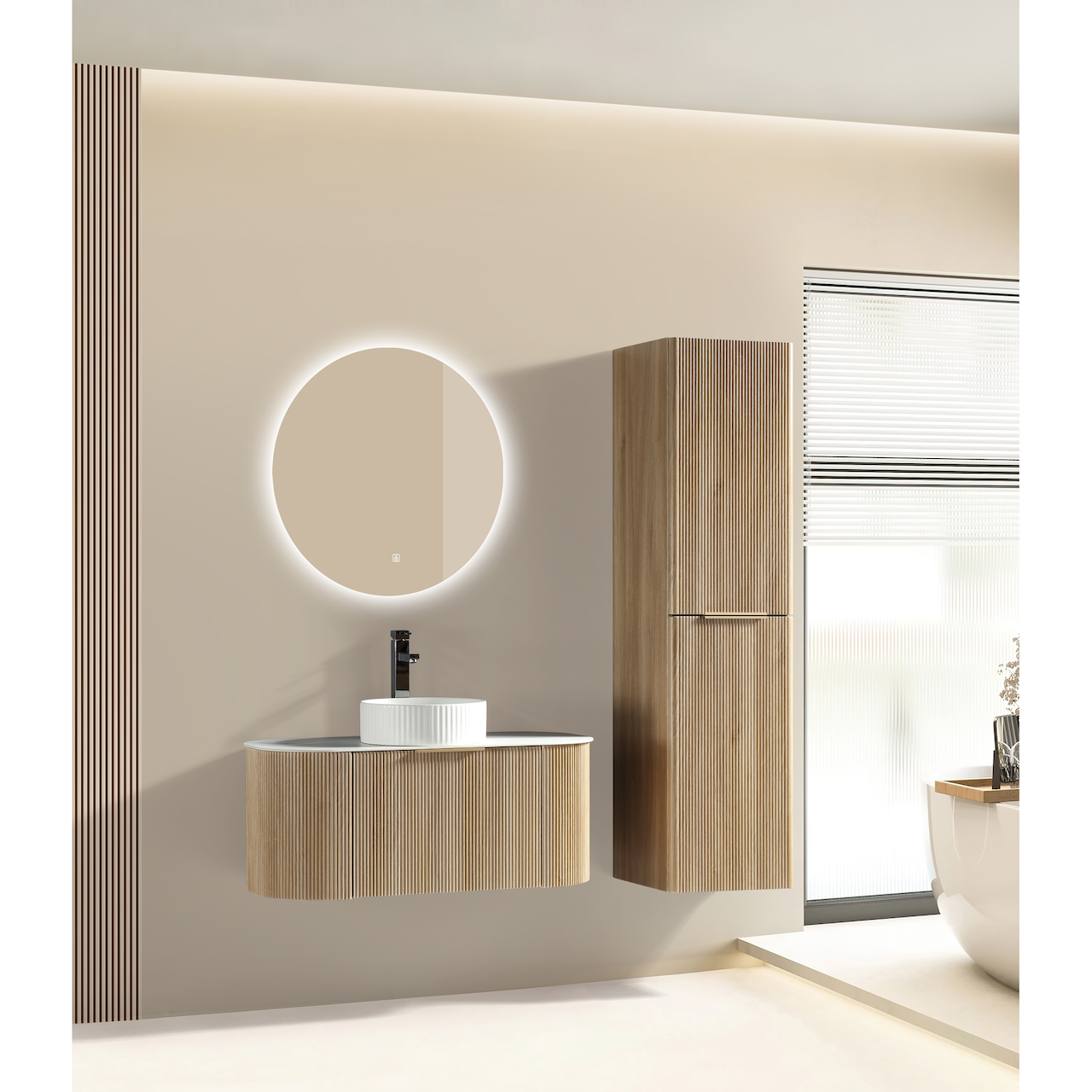 Dørene har en soft close-funksjon som sørger for myk lukking og forlenget levetid. Høyskapet kommer ferdig montert, og har to dører. Det finnes også baderomsmøbel i samme serie.