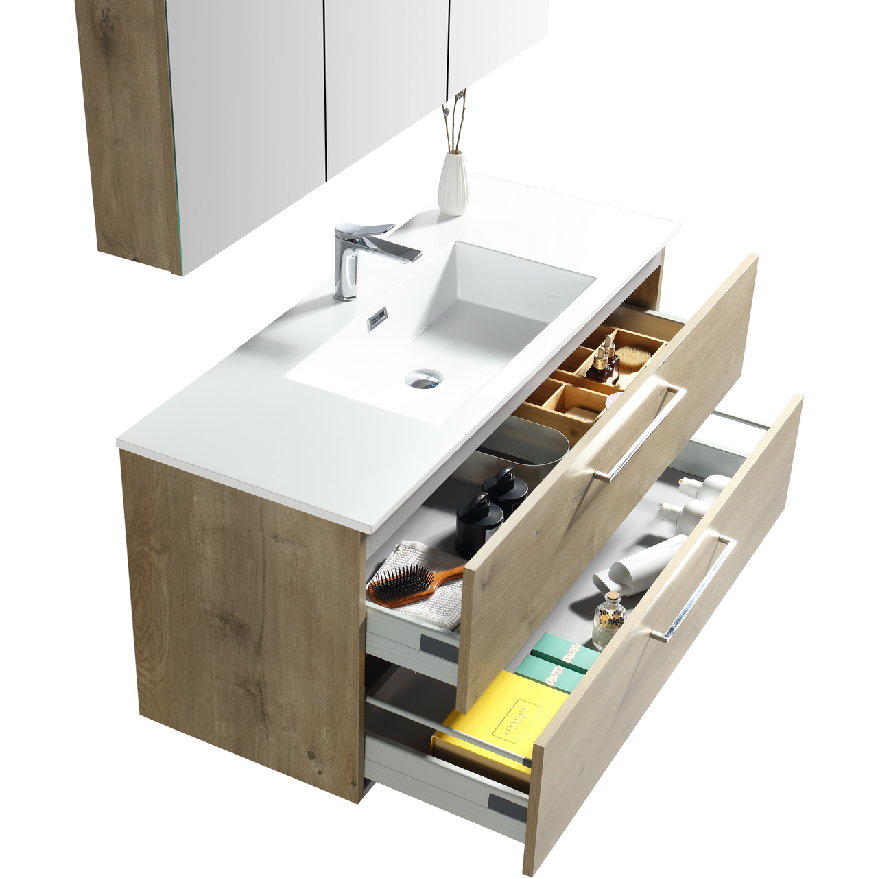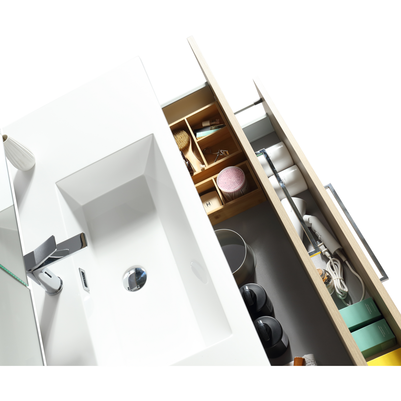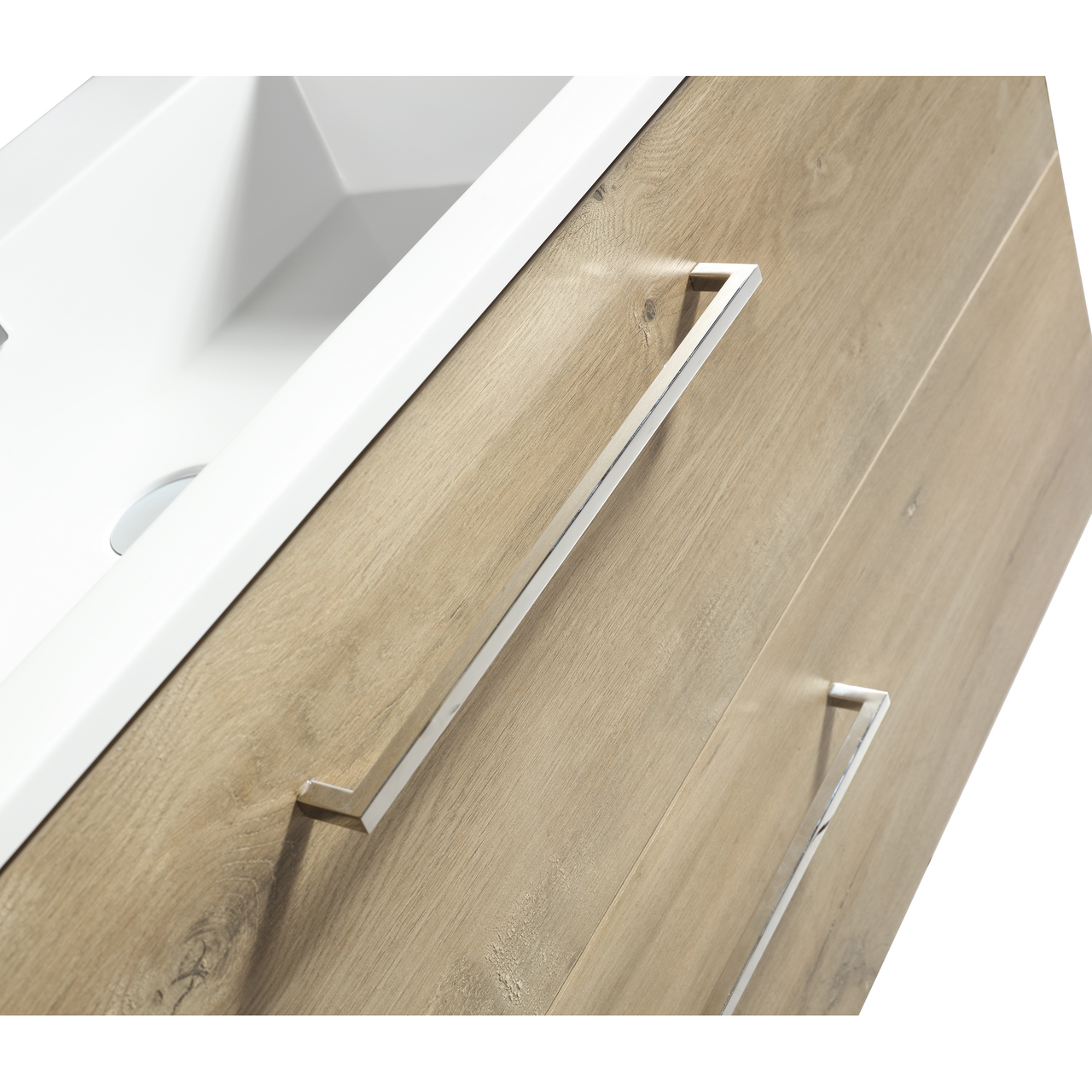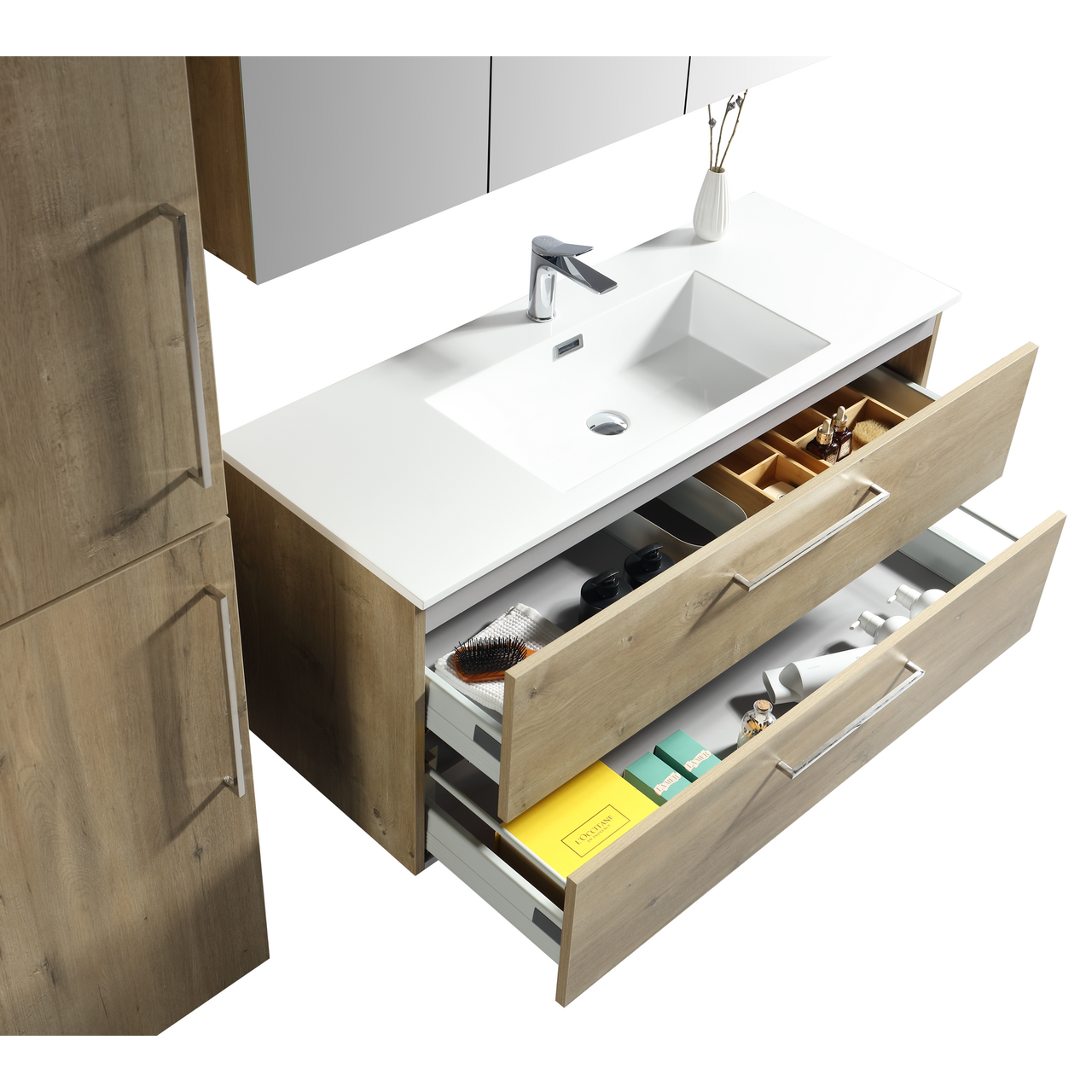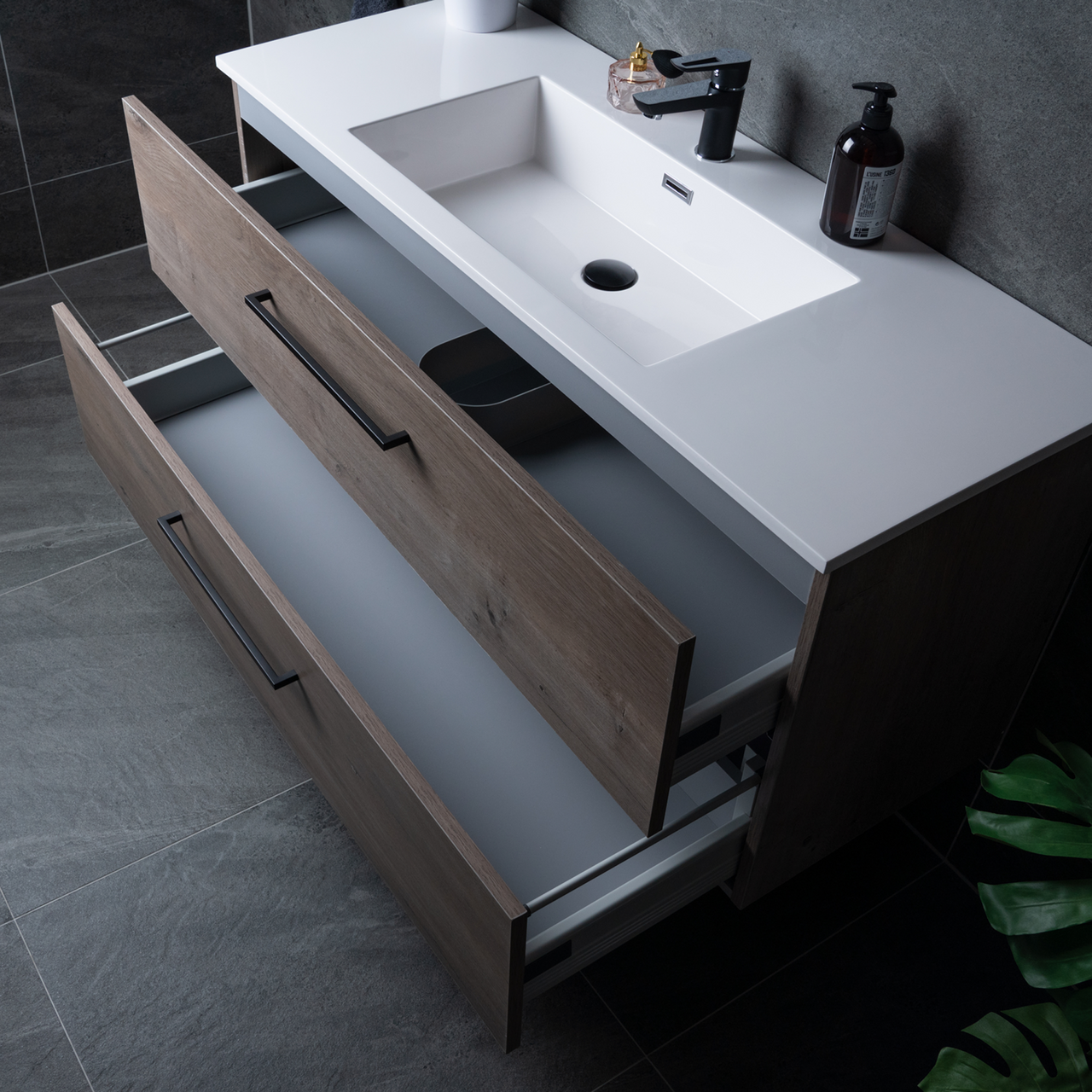 Baderomsmøbelet kommer ferdig montert, med en servant i støpemarmor med overløp. Med i pakken følger det også med et speilskap med god lagringsplass. Skuffene på møbelet har en soft close-funksjon som sørger for myk lukking og forlenget levetid. Baderomsmøbelet kommer uten håndtak slik at du kan sette ditt personlige preg på møbelet ved å velge håndtak selv.