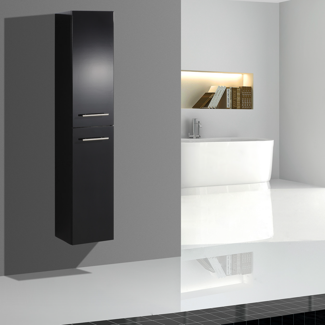 Lind Essence er en moderne møbelserie, som passer godt inn i de fleste baderom. Dette høyskapet har rette linjer, og en foliert, sort overflate i høyglans. Den folierte overflaten gjør rengjøringen enklere, og bevarer møbelets slitestyrke.