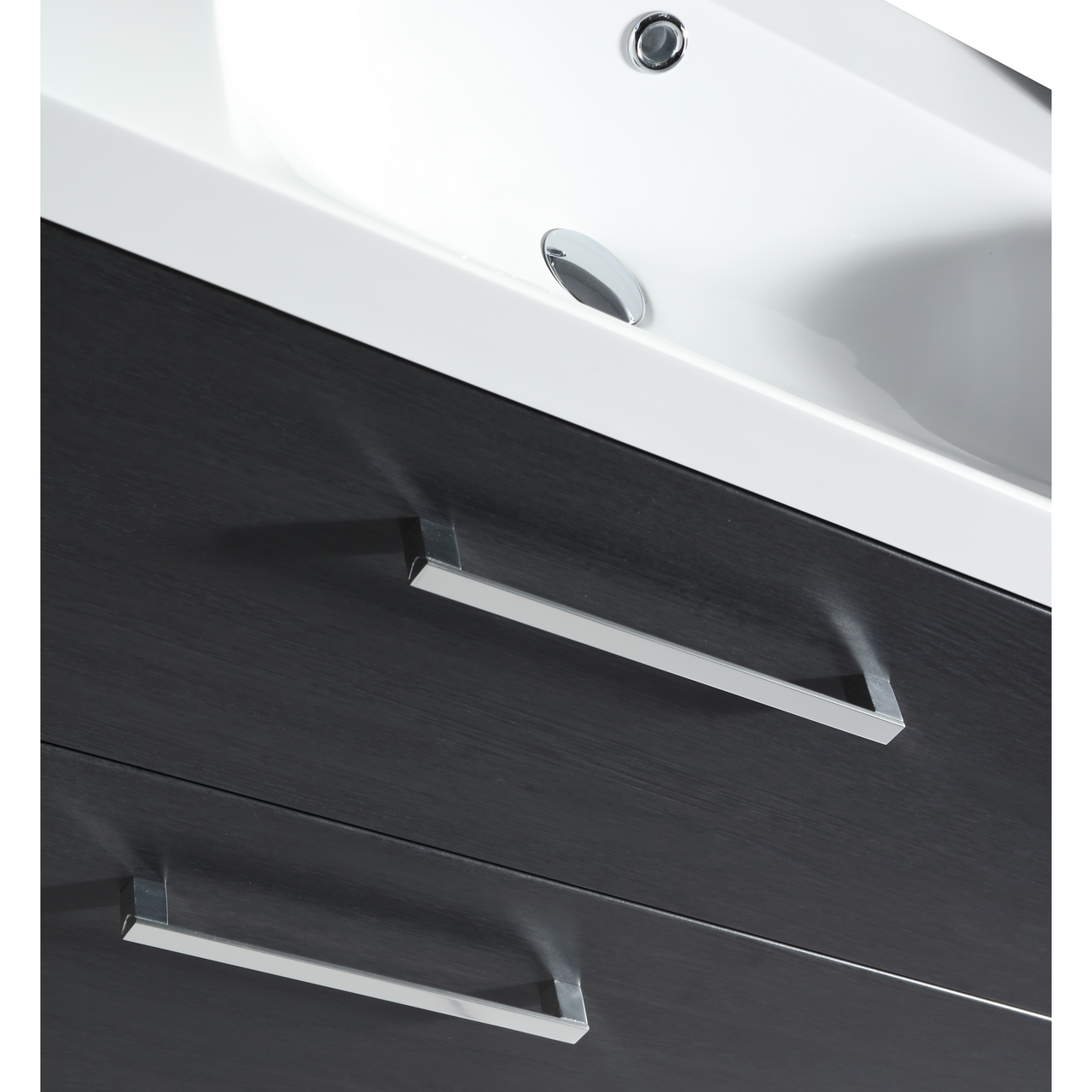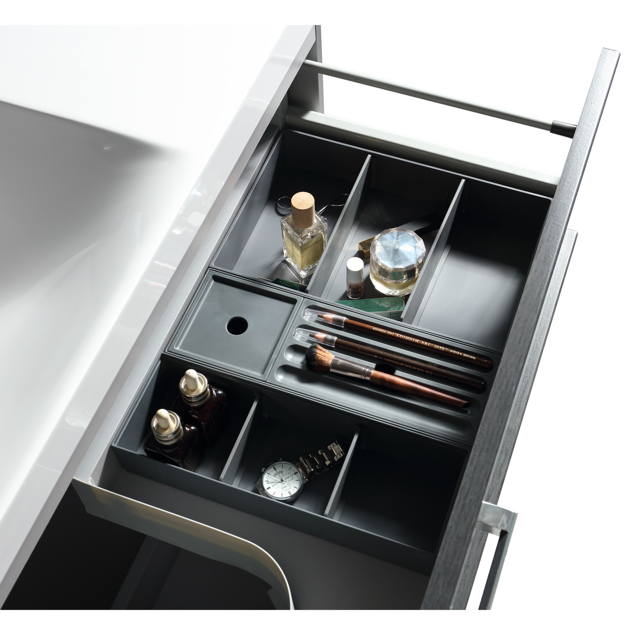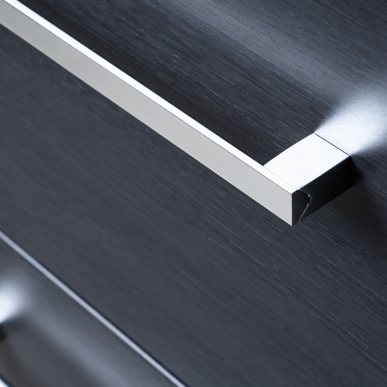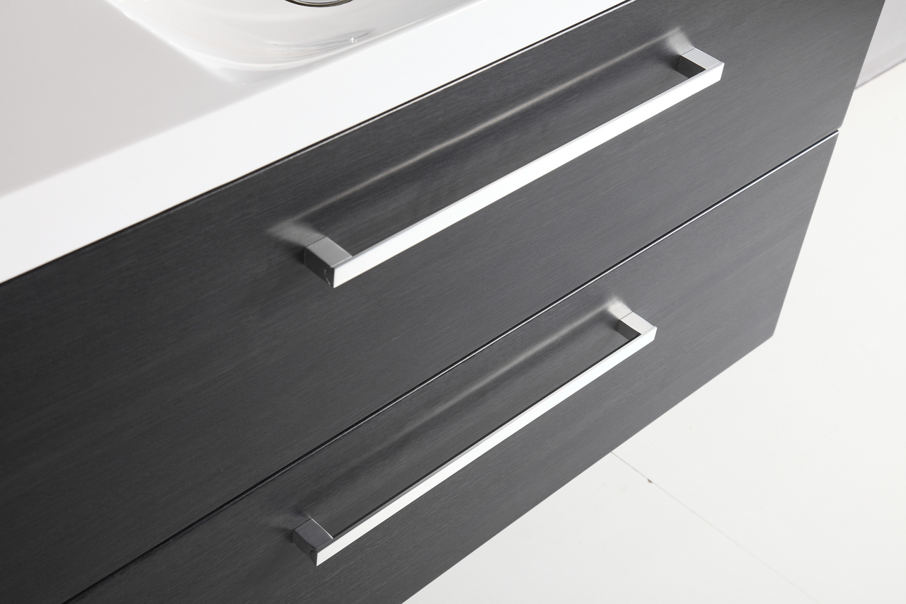 Skuffene på møbelet har håndtak i krom, og en soft close-funksjon som sørger for myk lukking og forlenget levetid. Baderomsmøbelet finnes i flere størrelser, og det finnes også høyskap i samme serie.