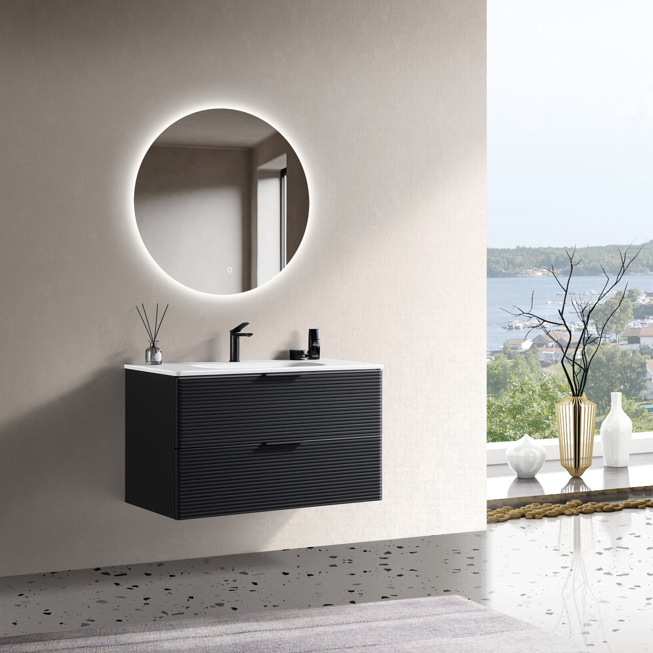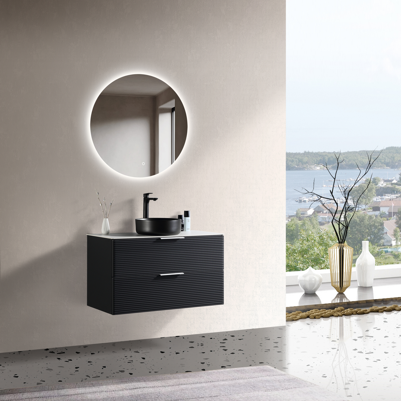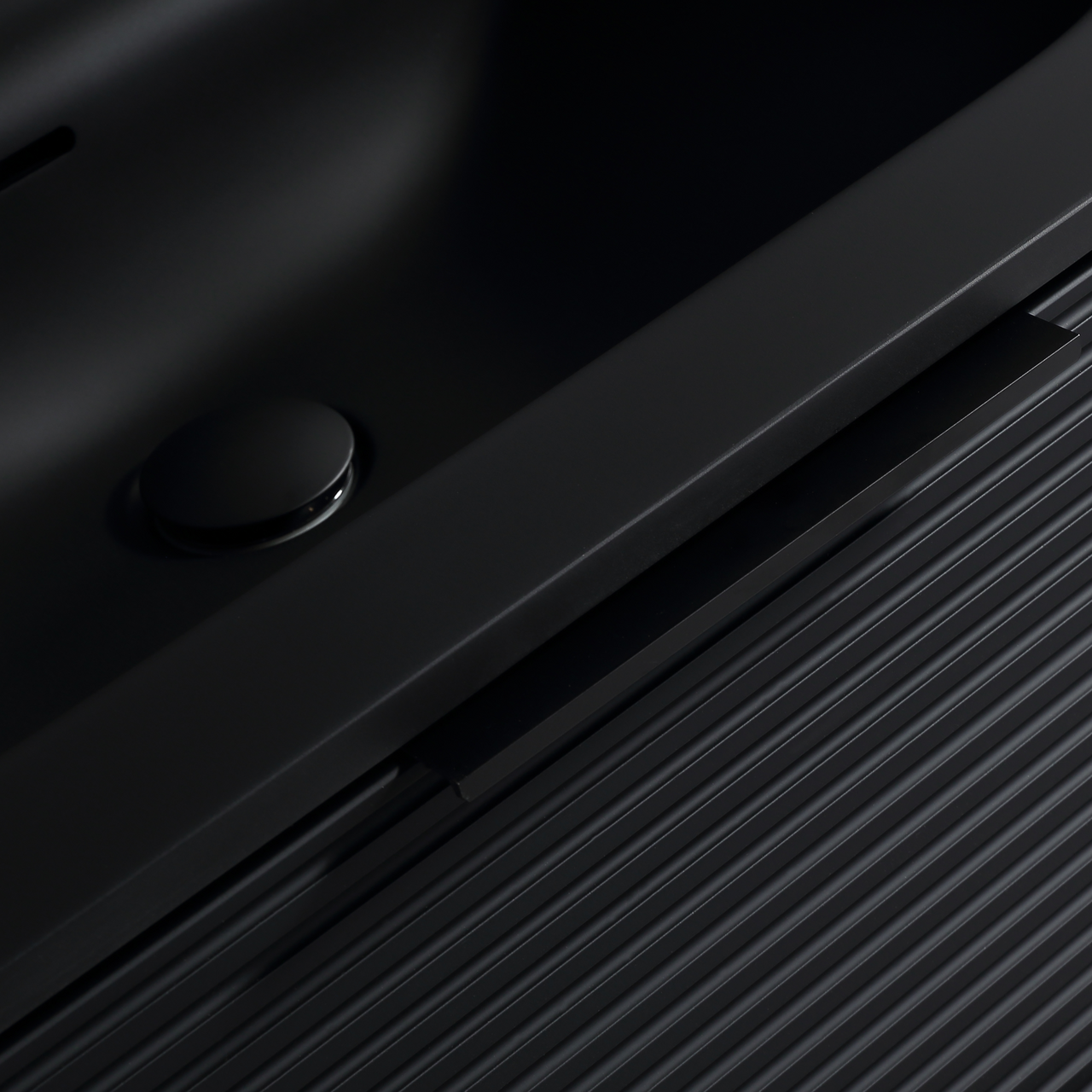 Lind Timber er en moderne møbelserie med en matt sort overflate. Dette baderomsmøbelet har riller i front, og en foliert overflate. Den folierte overflaten gjør rengjøringen enklere, og bevarer møbelets slitestyrke.