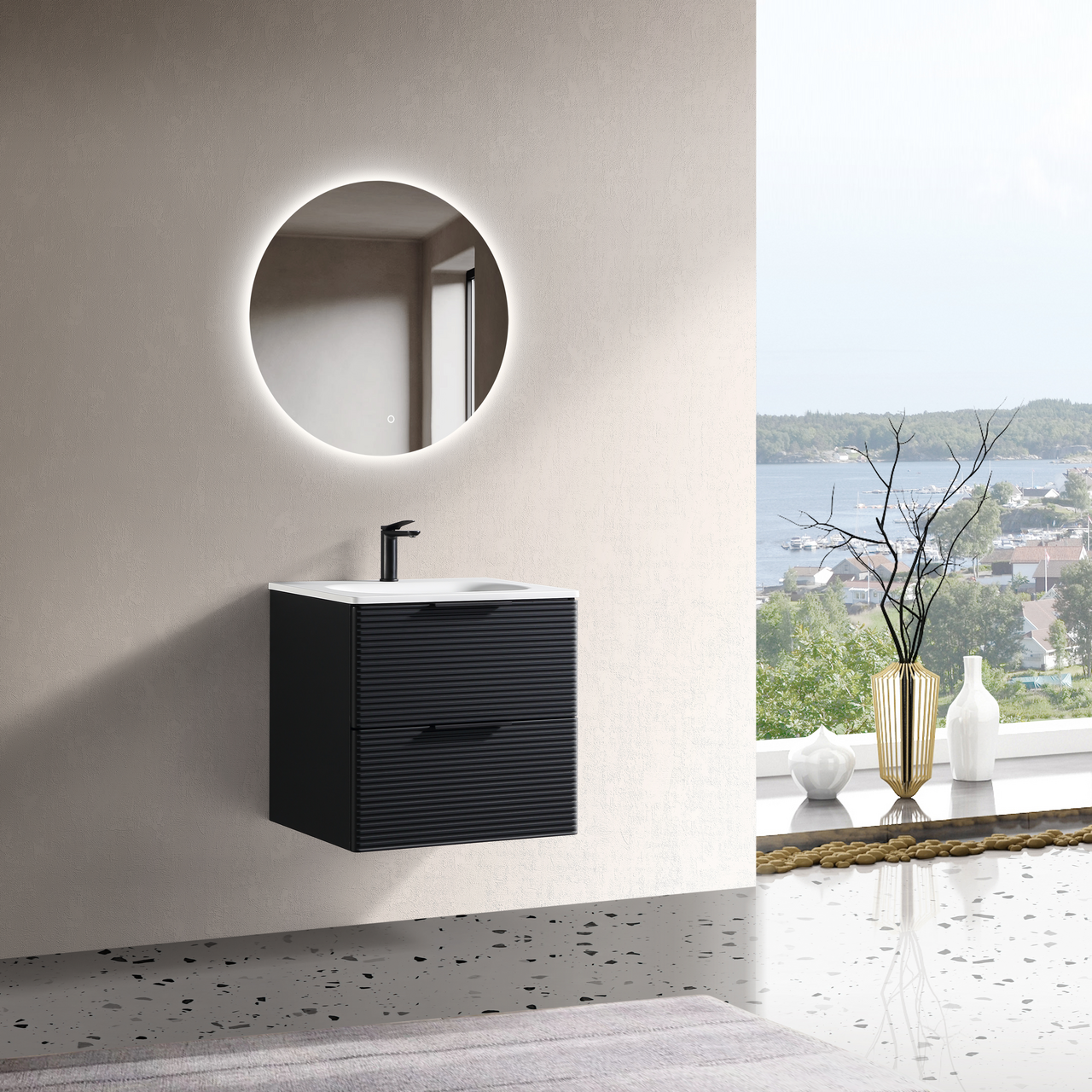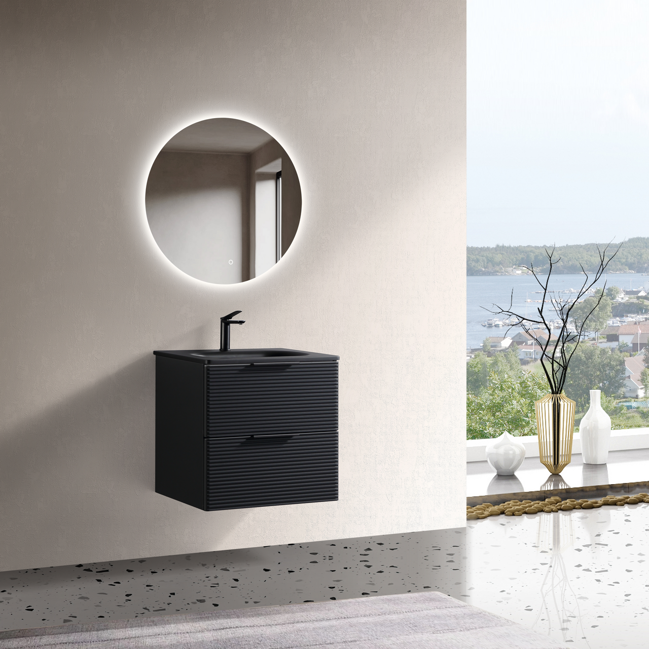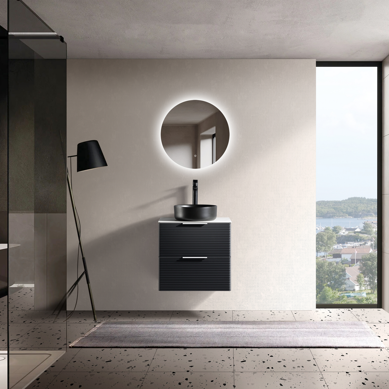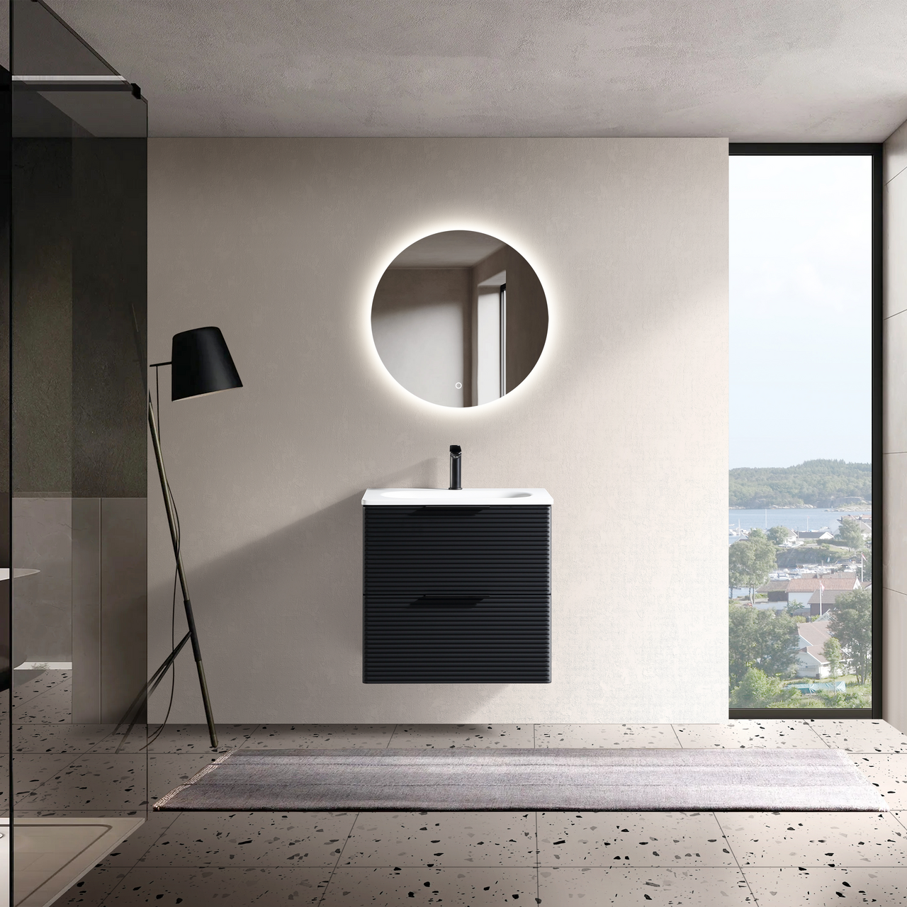 Lind Timber er en moderne møbelserie med en matt sort overflate. Dette baderomsmøbelet har riller i front, og en foliert overflate. Den folierte overflaten gjør rengjøringen enklere, og bevarer møbelets slitestyrke.