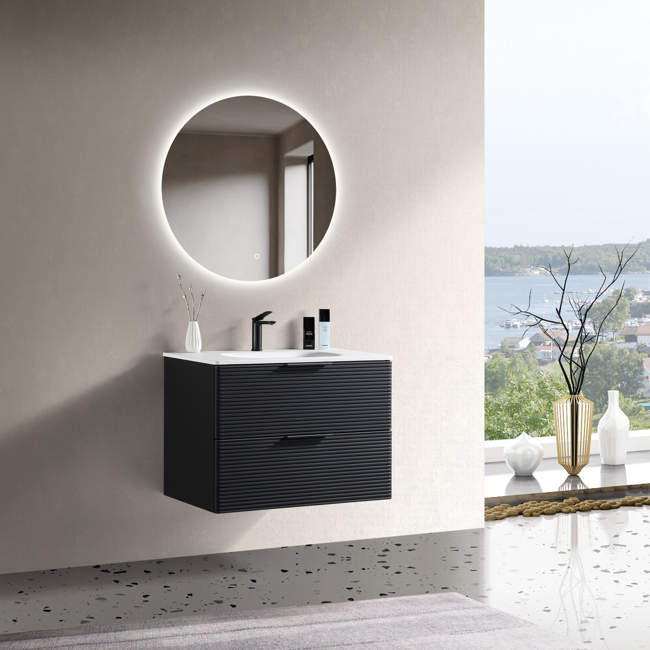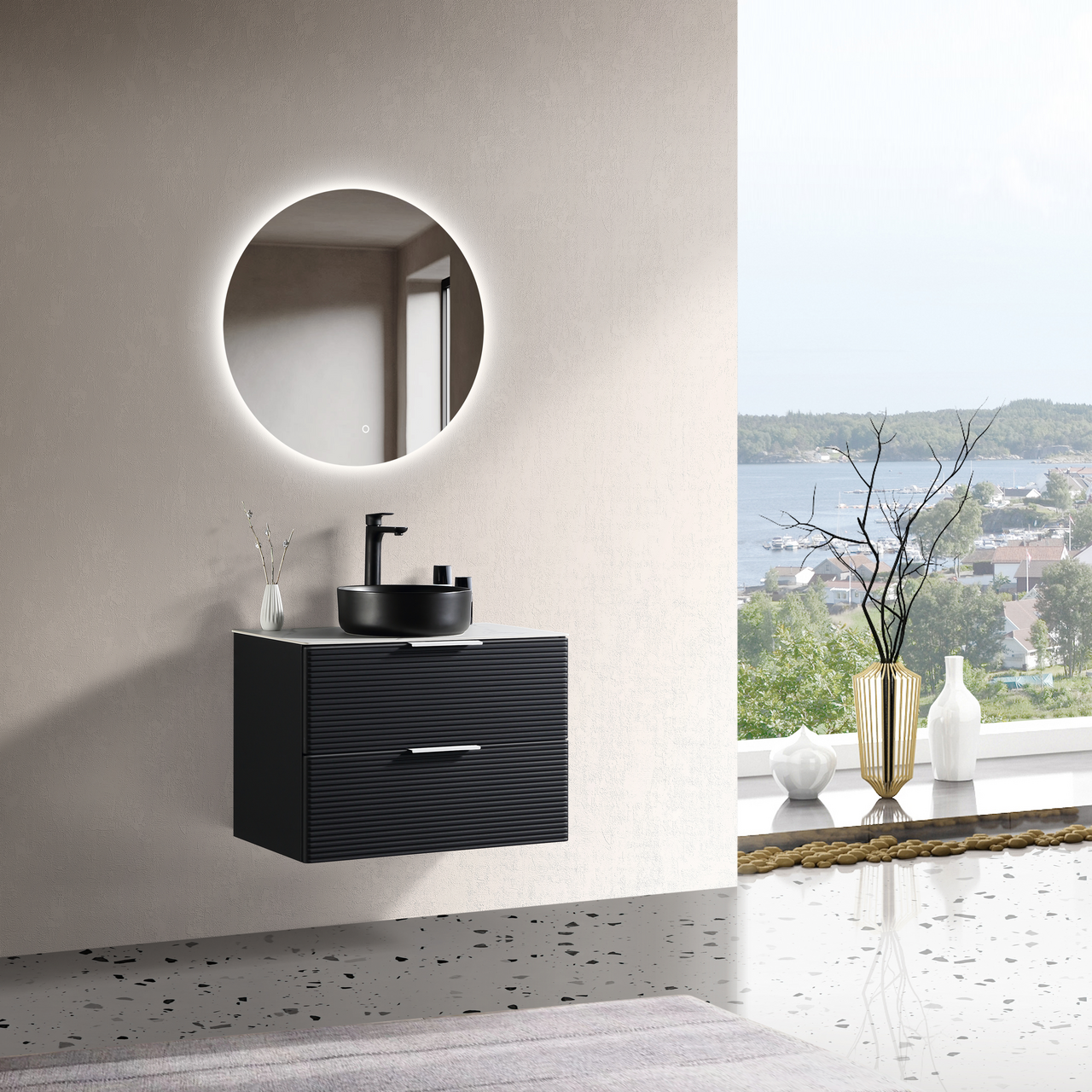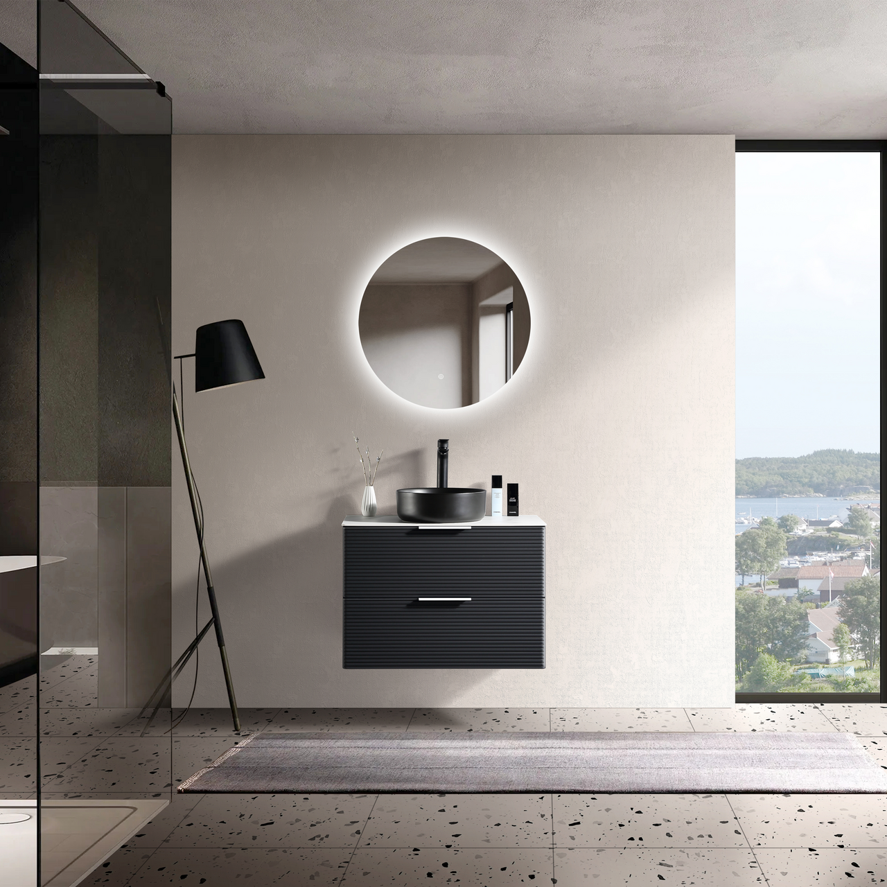 Lind Timber er en moderne møbelserie med en matt sort overflate. Dette baderomsmøbelet har riller i front, og en foliert overflate. Den folierte overflaten gjør rengjøringen enklere, og bevarer møbelets slitestyrke.