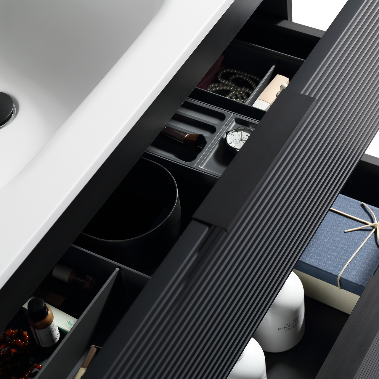 Baderomsmøbelet kommer ferdig montert, og skuffene har en soft close-funksjon som sørger for myk lukking og forlenget levetid. Møbelet kommer uten topplate/servant, slik at du kan velge mellom servant eller benkeplate og frittstående servant.