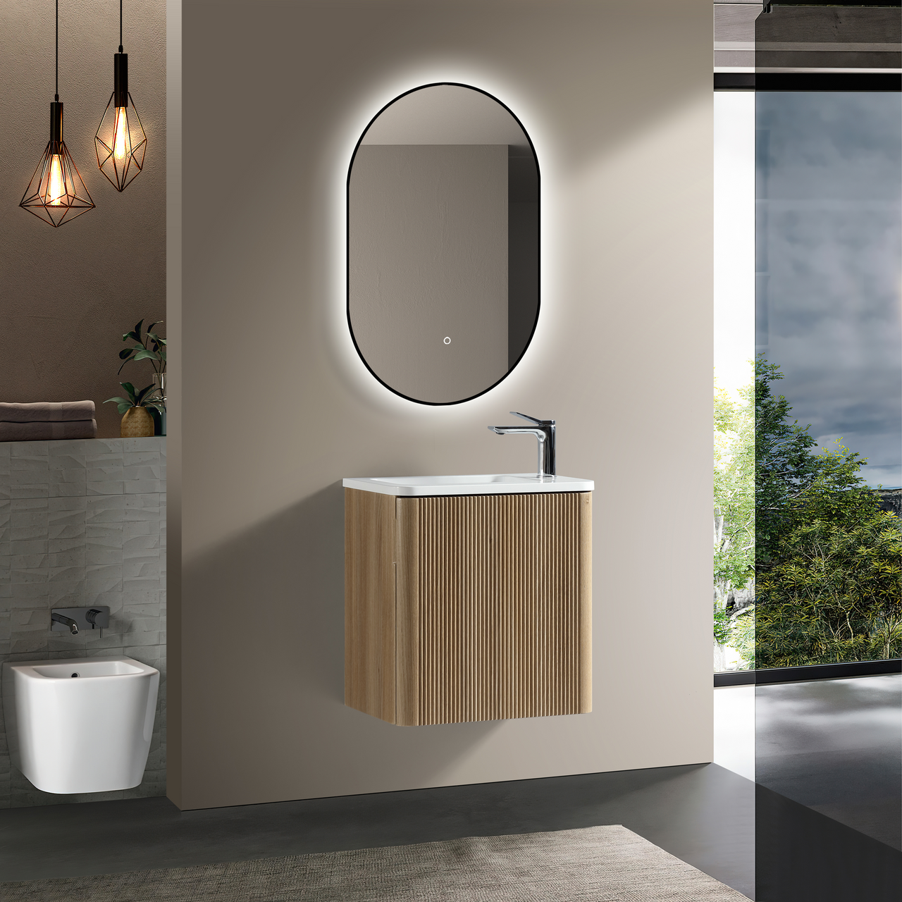 Lind Timber er en moderne møbelserie med en eikefarget overflate. Dette baderomsmøbelet har riller i front, og en foliert overflate. Den folierte overflaten gjør rengjøringen enklere, og bevarer møbelets slitestyrke.
