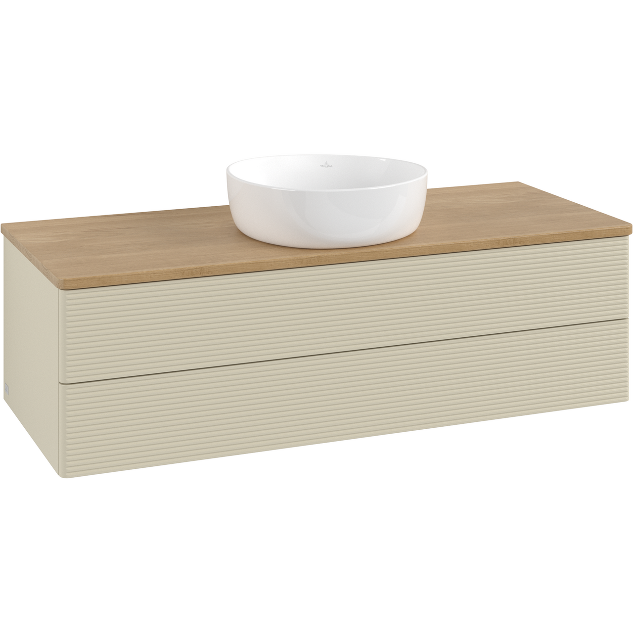 V&b antao servantskap 2 skuffer rillet 1200x360x500 u/kranhull m/lys silkegrå/eik