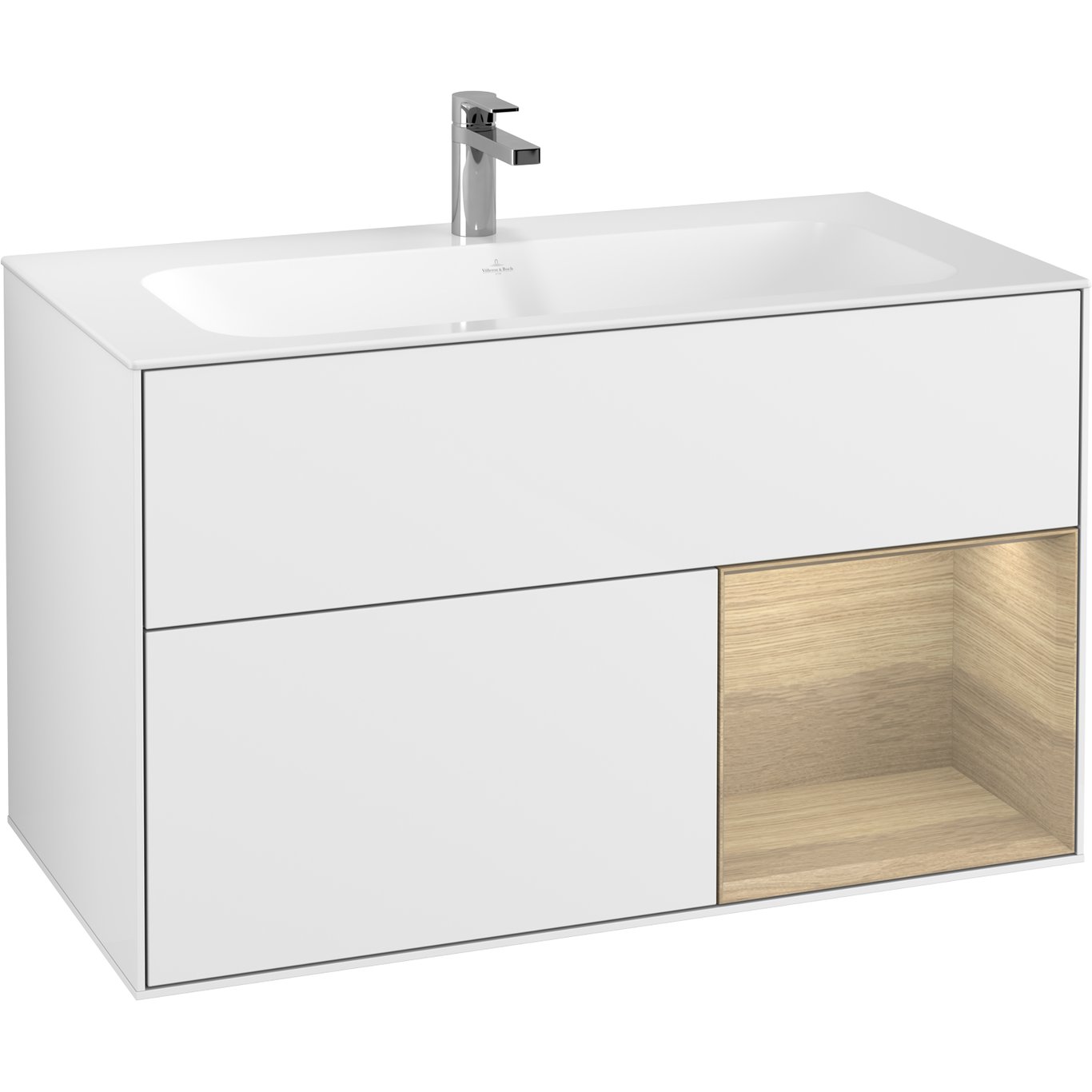 V&b finion servantskap 100 hvit høyglans lakk m/lys, høyrestilt eikefinér hylle