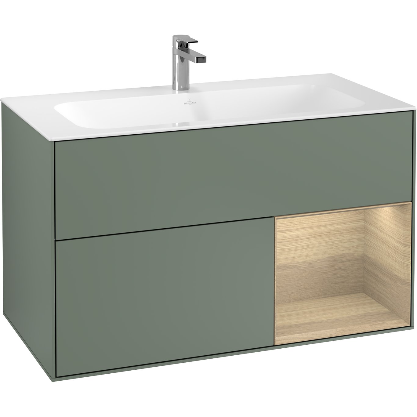 V&b finion servantskap 100 oliven matt lakk m/lys, høyrestilt eikefinér hylle