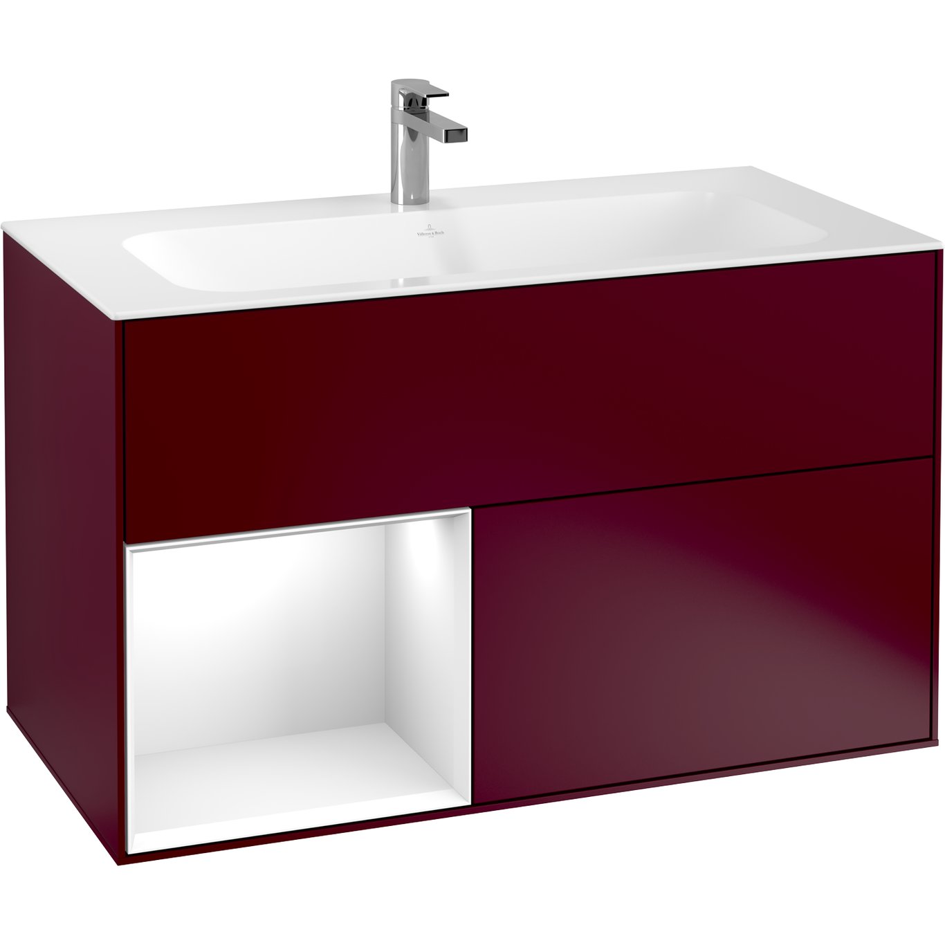 Finion fra Villeroy & Boch er en stilren baderomsserie, som skaper en helhet på baderommet. Dette servantskapet i Finion-serien har rette, rene linjer, to skuffer, indirekte veggbelysning og en åpen venstrestilt hylle med dimbart LED-lys. Servantskapet fås i et bredt utvalg av farger, så du kan velge fargen du ønsker.