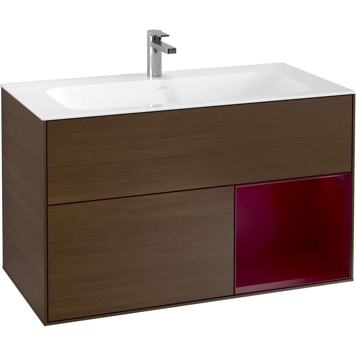 Finion fra Villeroy & Boch er en stilren baderomsserie, som skaper en helhet på baderommet. Dette servantskapet i Finion-serien har rette, rene linjer, to skuffer og en åpen høyrestilt hylle med dimbart LED-lys. Servantskapet fås i et bredt utvalg av farger, så du kan velge fargen du ønsker.