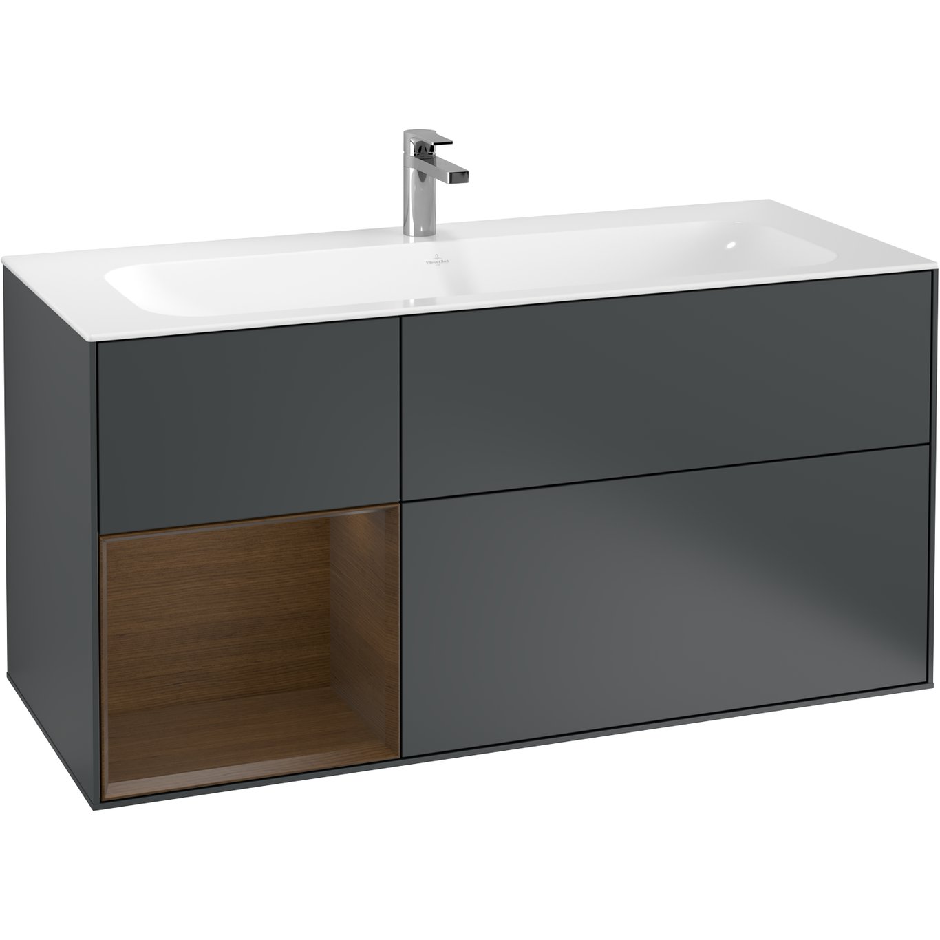 V&B FINION SERVANTSKAP 120 MIDNATTSBLÅ MATT LAKK EMOTION-LYS, VENSTRESTILT VALNØTTHYLLE