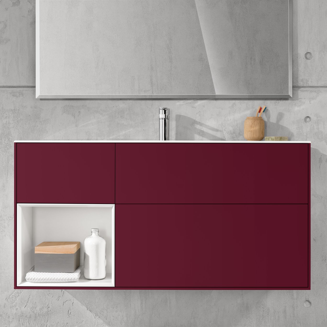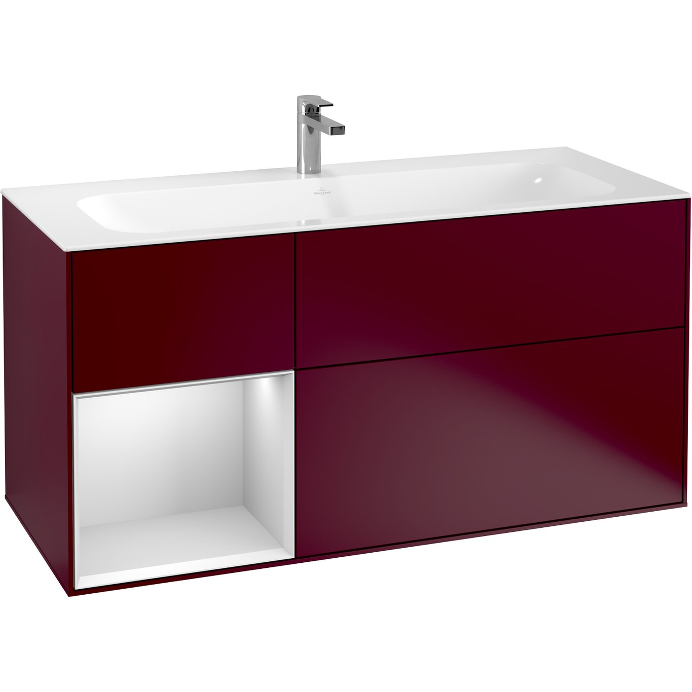 Finion fra Villeroy & Boch er en stilren baderomsserie, som skaper en helhet på baderommet. Dette servantskapet i Finion-serien har rette, rene linjer, tre skuffer, indirekte veggbelysning og en åpen venstrestilt hylle med dimbart LED-lys. Servantskapet fås i et bredt utvalg av farger, så du kan velge fargen du ønsker.