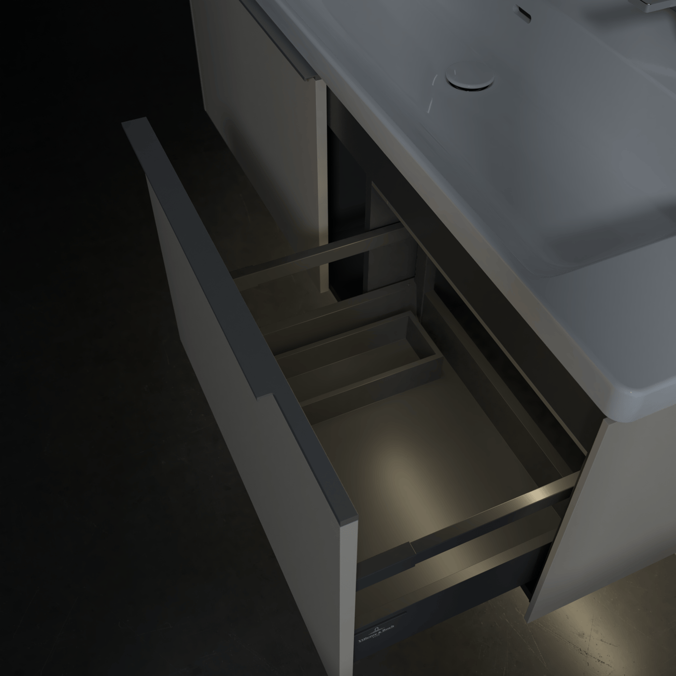 Servantskapet har belyste skuffer med god oppbevaringsplass, og en soft close- og self close-funksjon som sørger for myk lukking, selv når skuffene blir smelt igjen. LED-lyset i skuffen har integrert bevegelsessensor så den automatisk skrur seg på og av når skuffen åpnes og lukkes.