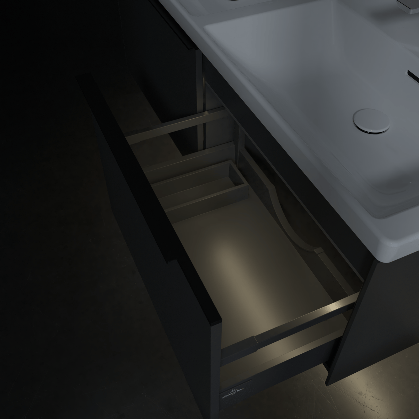Servantskapet har belyste skuffer med god oppbevaringsplass, og en soft close- og self close-funksjon som sørger for myk lukking, selv når skuffene blir smelt igjen. LED-lyset i skuffen har integrert bevegelsessensor så den automatisk skrur seg på og av når skuffen åpnes og lukkes.