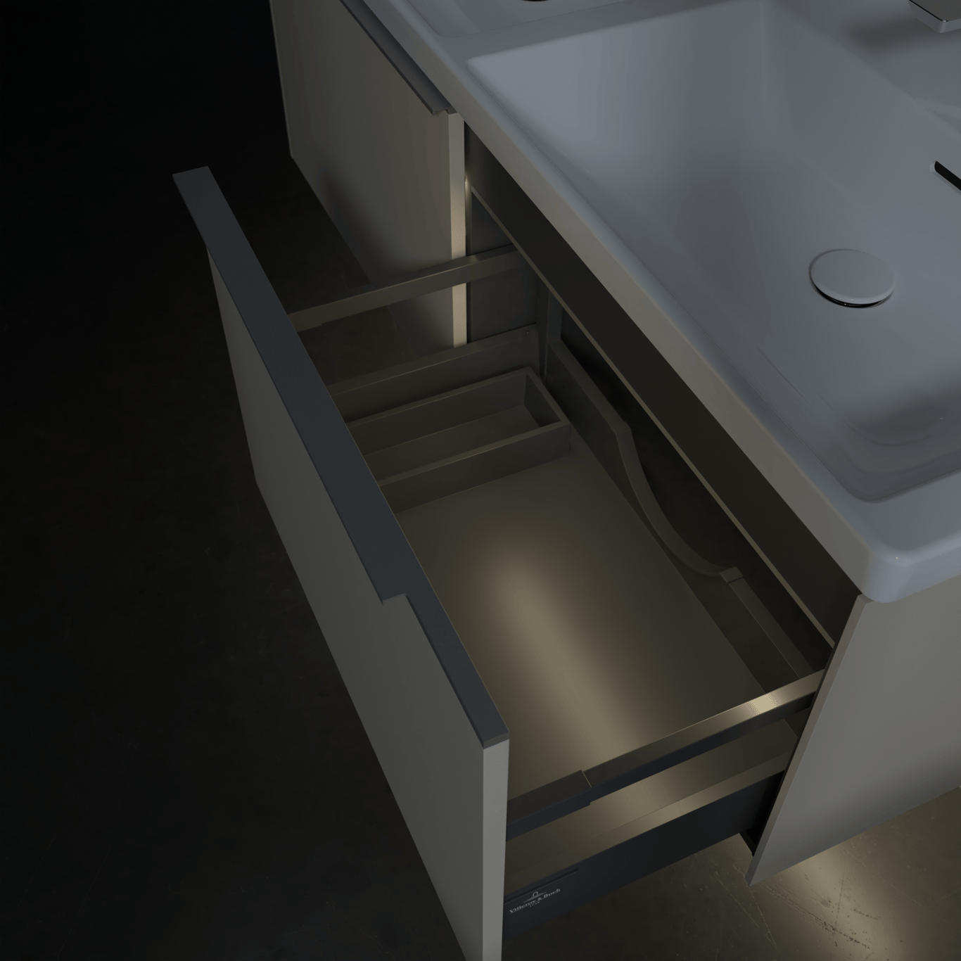 Servantskapet har belyste skuffer med god oppbevaringsplass, og en soft close- og self close-funksjon som sørger for myk lukking, selv når skuffene blir smelt igjen. LED-lyset i skuffen har integrert bevegelsessensor så den automatisk skrur seg på og av når skuffen åpnes og lukkes.