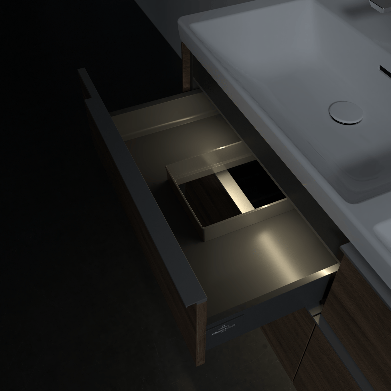 Servantskapet har belyste skuffer med god oppbevaringsplass, og en soft close- og self close-funksjon som sørger for myk lukking, selv når skuffene blir smelt igjen. LED-lyset i skuffen har integrert bevegelsessensor så den automatisk skrur seg på og av når skuffen åpnes og lukkes.