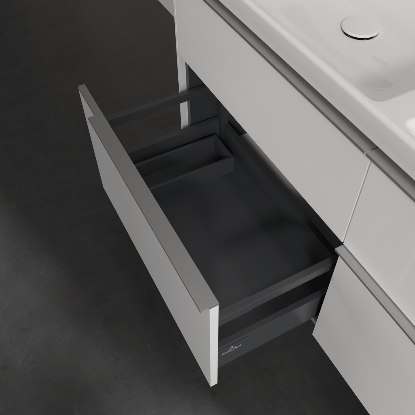 Servantskapet har skuffer med god oppbevaringsplass, og en soft close- og self close-funksjon som sørger for myk lukking, selv når skuffene blir smelt igjen.