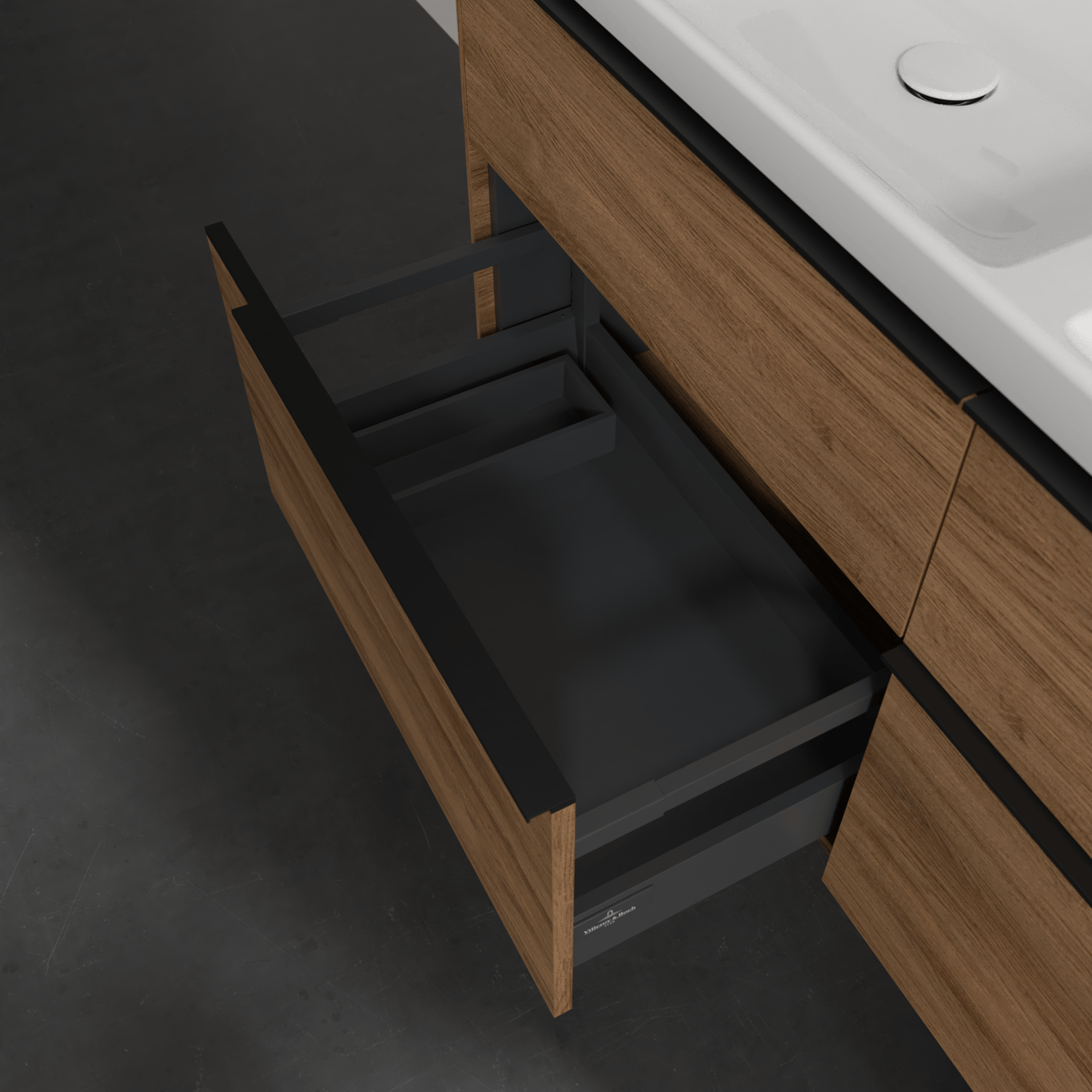 Servantskapet har belyste skuffer med god oppbevaringsplass, og en soft close- og self close-funksjon som sørger for myk lukking, selv når skuffene blir smelt igjen. LED-lyset i skuffen har integrert bevegelsessensor så den automatisk skrur seg på og av når skuffen åpnes og lukkes.