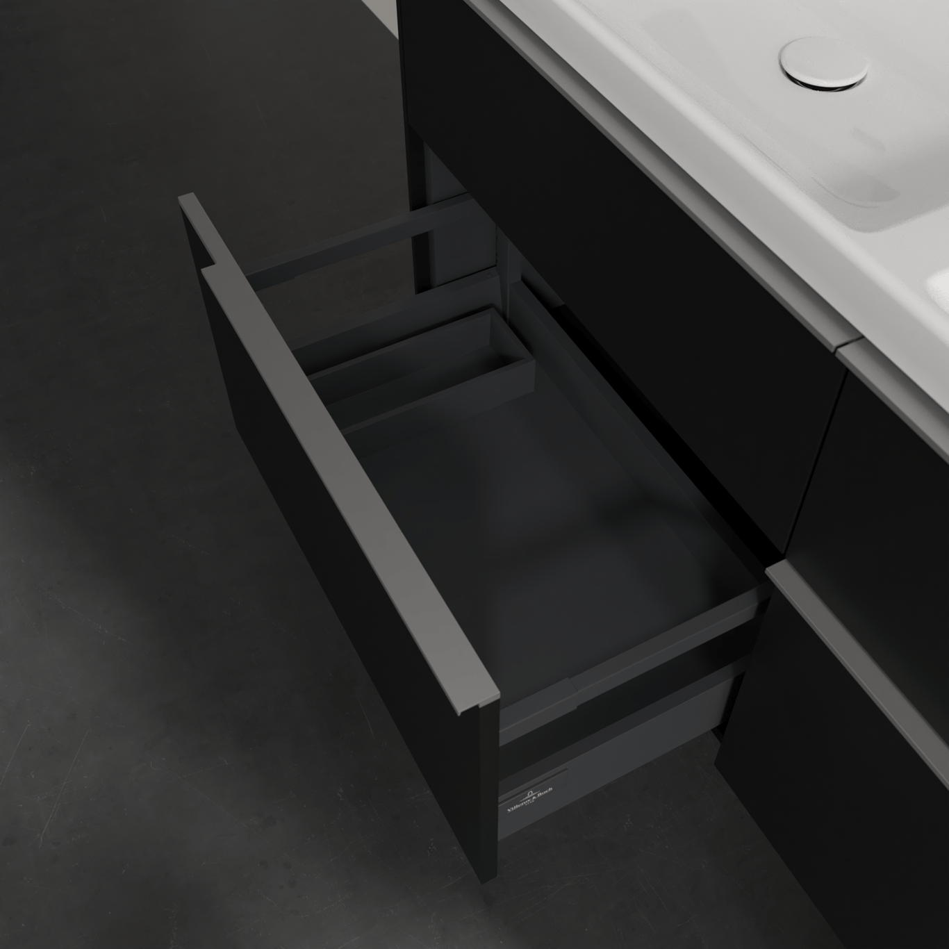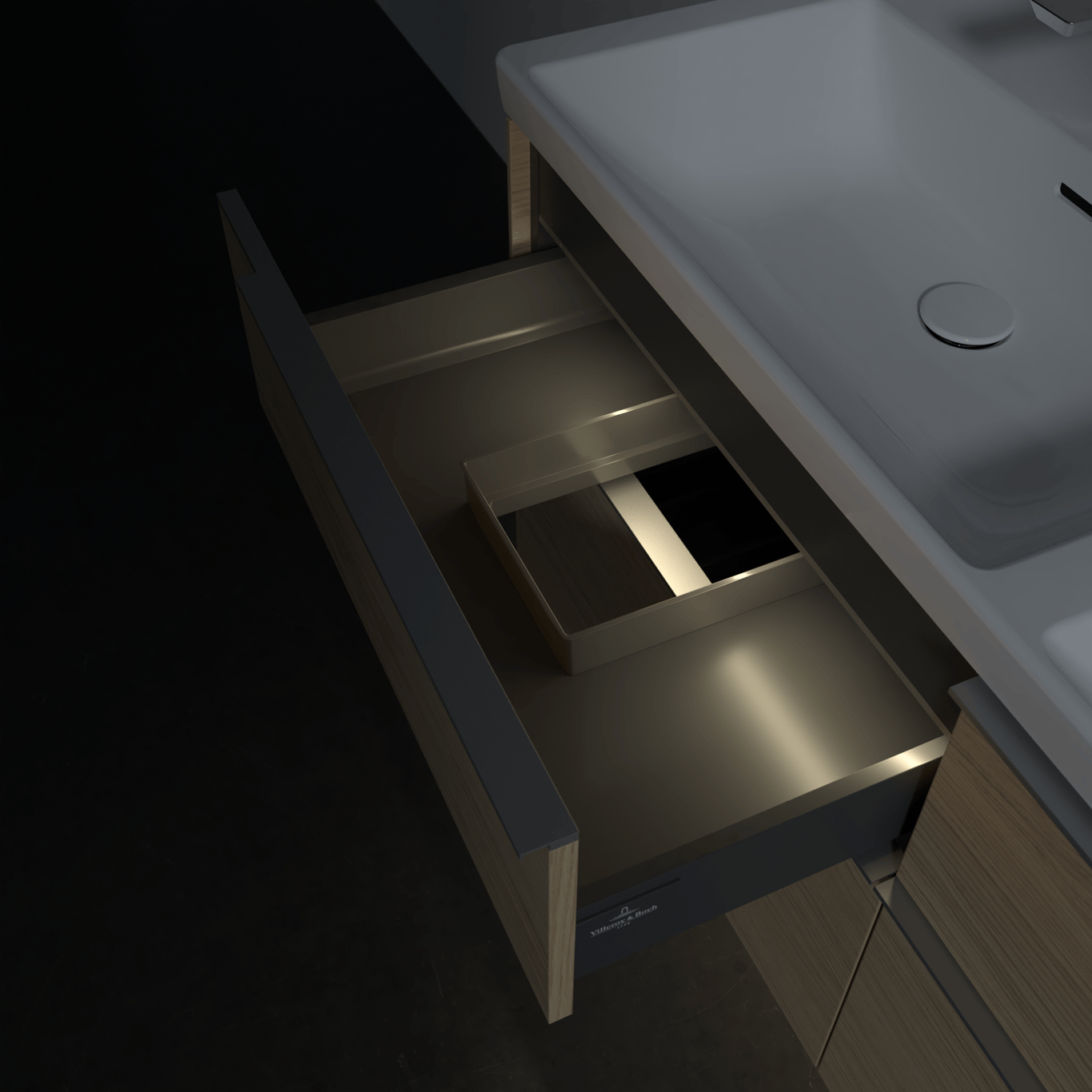 Servantskapet har belyste skuffer med god oppbevaringsplass, og en soft close- og self close-funksjon som sørger for myk lukking, selv når skuffene blir smelt igjen. LED-lyset i skuffen har integrert bevegelsessensor så den automatisk skrur seg på og av når skuffen åpnes og lukkes.