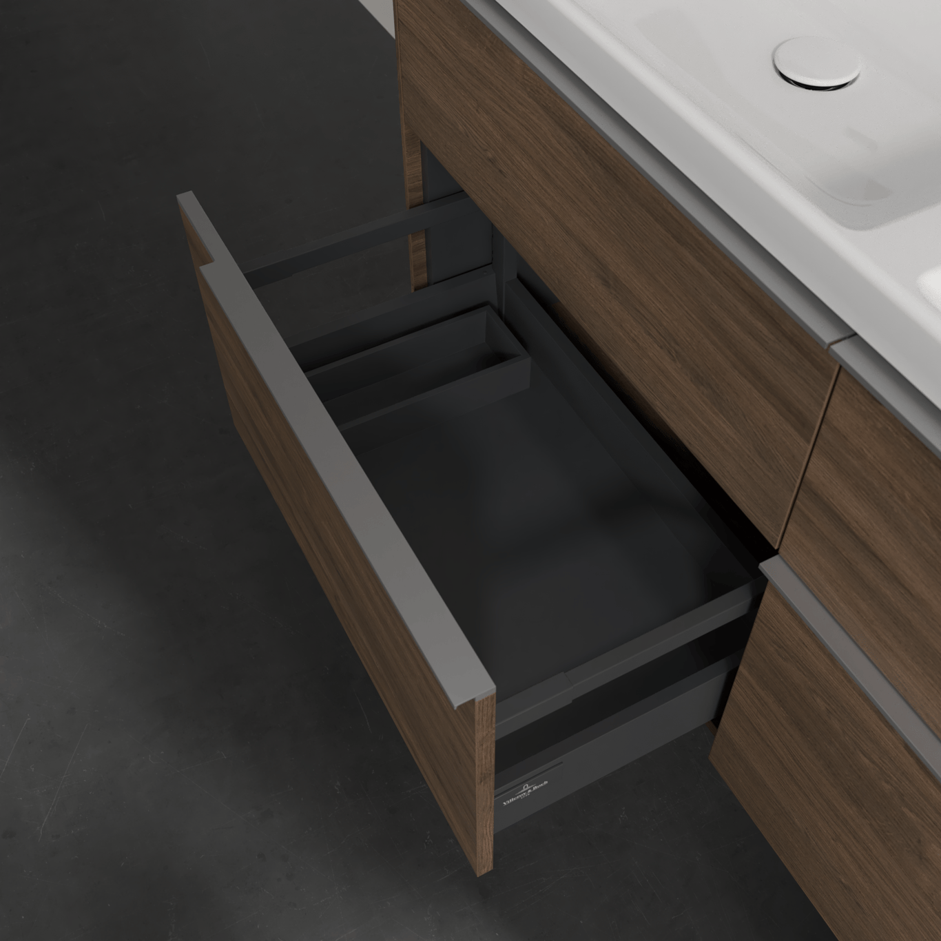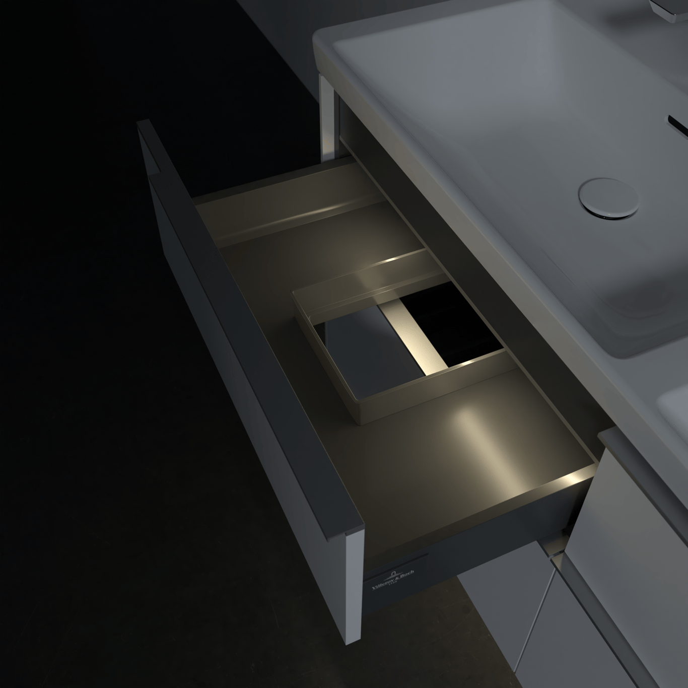 Servantskapet har belyste skuffer med god oppbevaringsplass, og en soft close- og self close-funksjon som sørger for myk lukking, selv når skuffene blir smelt igjen. LED-lyset i skuffen har integrert bevegelsessensor så den automatisk skrur seg på og av når skuffen åpnes og lukkes.