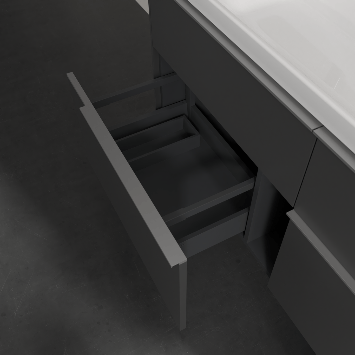 Servantskapet har belyste skuffer med god oppbevaringsplass, og en soft close- og self close-funksjon som sørger for myk lukking, selv når skuffene blir smelt igjen. LED-lyset i skuffen har integrert bevegelsessensor så den automatisk skrur seg på og av når skuffen åpnes og lukkes.