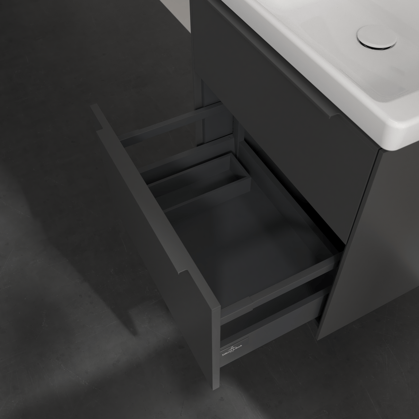 Servantskapet har belyste skuffer med god oppbevaringsplass, og en soft close- og self close-funksjon som sørger for myk lukking, selv når skuffene blir smelt igjen. LED-lyset i skuffen har integrert bevegelsessensor så den automatisk skrur seg på og av når skuffen åpnes og lukkes.