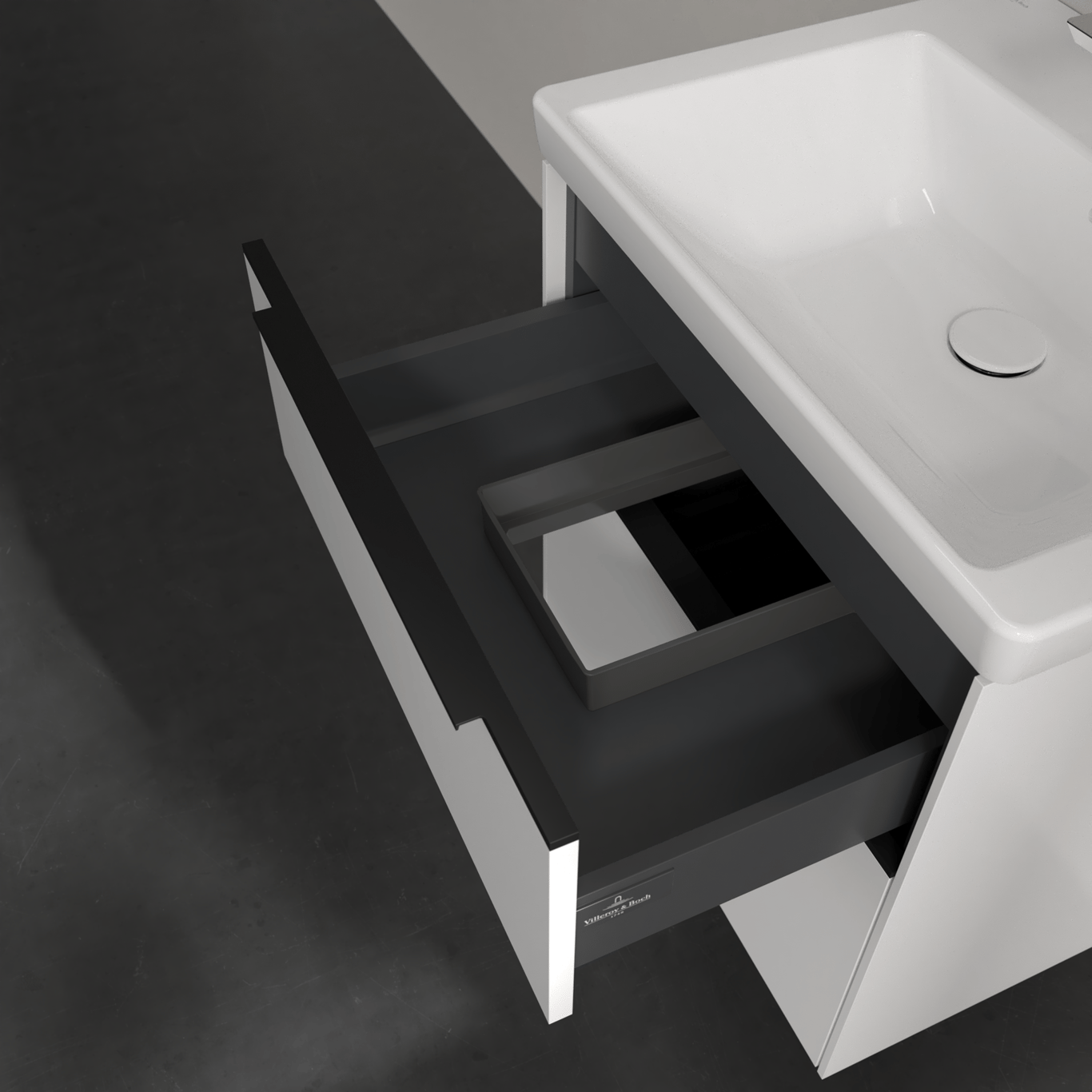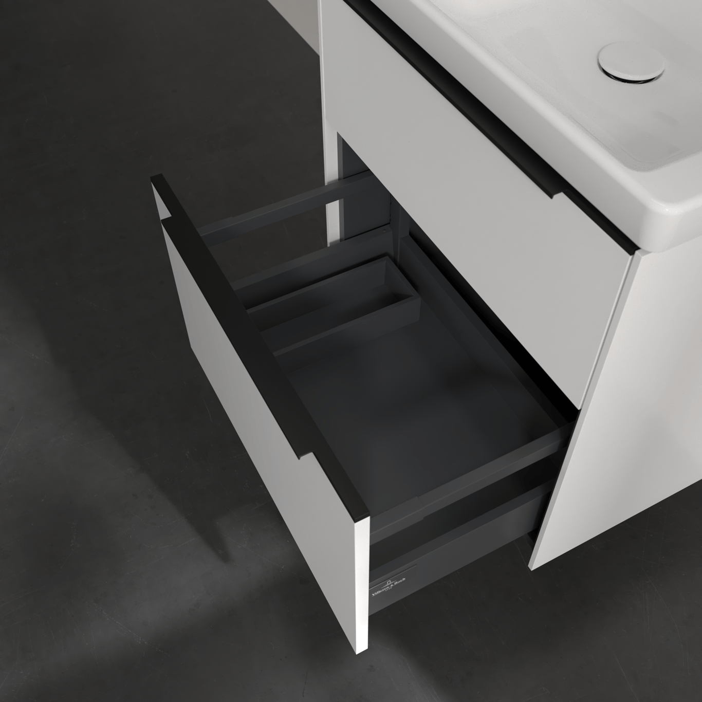 Servantskapet har skuffer med god oppbevaringsplass, og en soft close- og self close-funksjon som sørger for myk lukking, selv når skuffene blir smelt igjen.